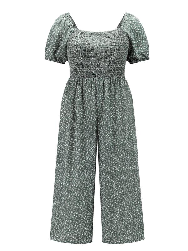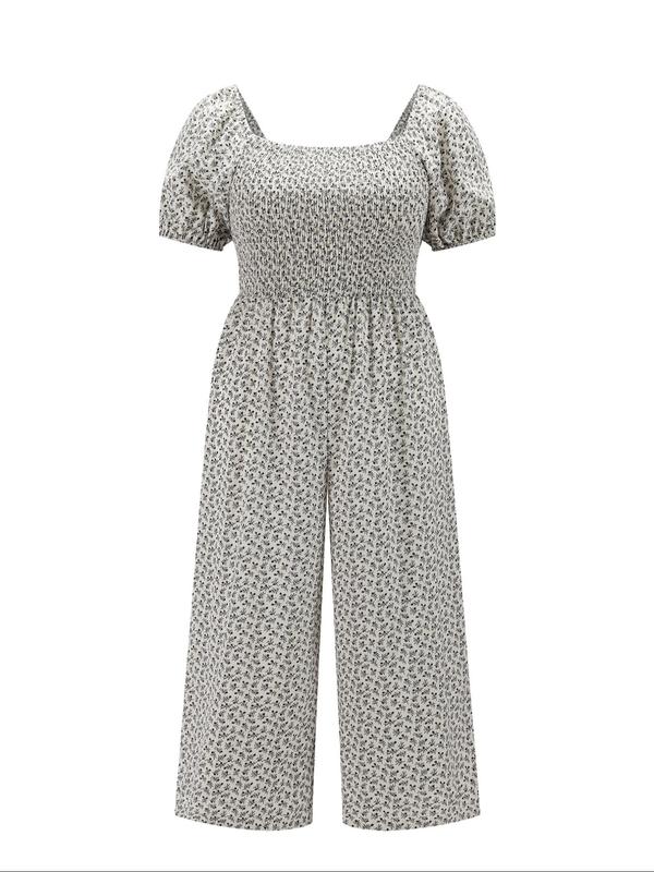 【Plus Size】 All Over Print Shirred Wide Leg Jumpsuit, Casual Short Sleeve Jumpsuit for Summer, Women's Plus Clothing for Daily Wear