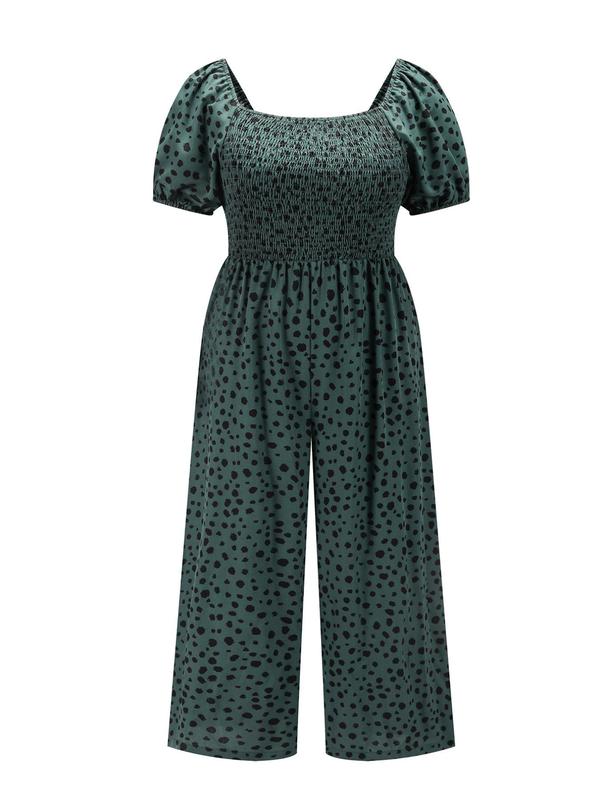 5. 【Plus Size】 All Over Print Shirred Wide Leg Jumpsuit, Casual Short Sleeve Jumpsuit for Summer, Women's Plus Clothing for Daily Wear