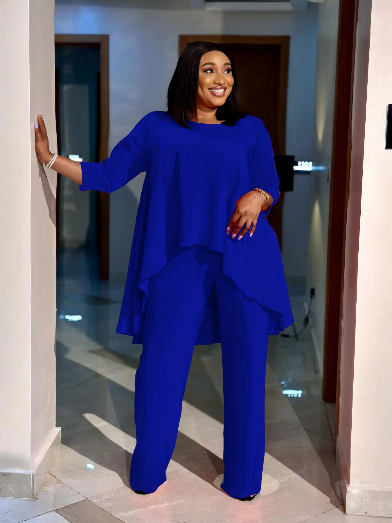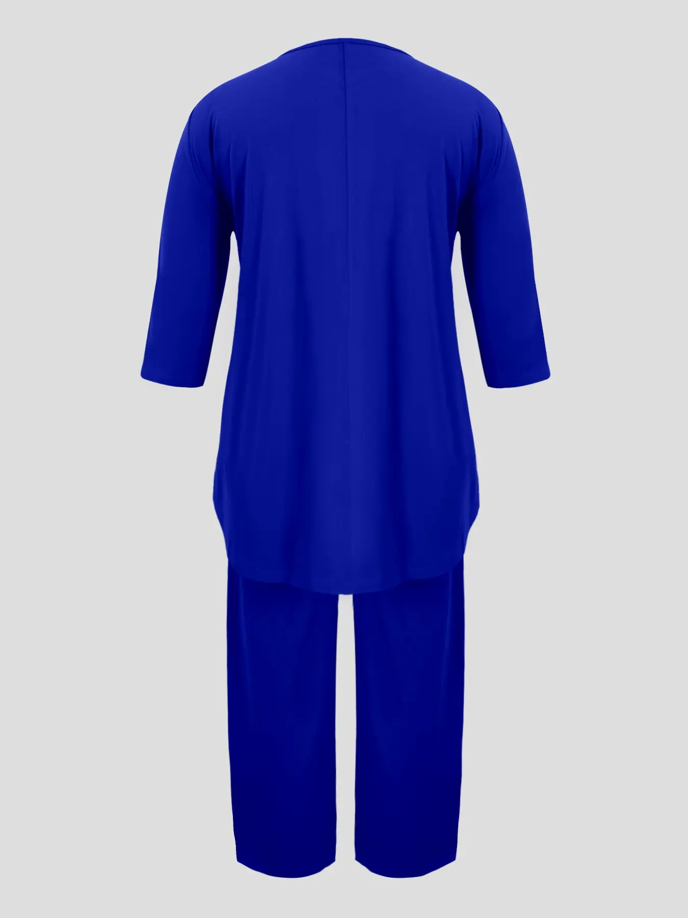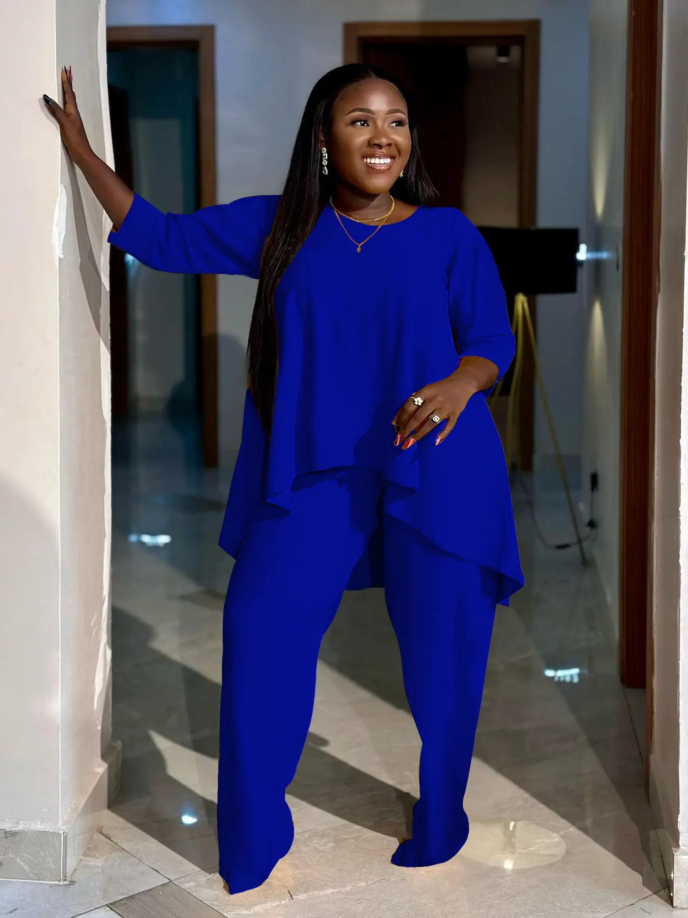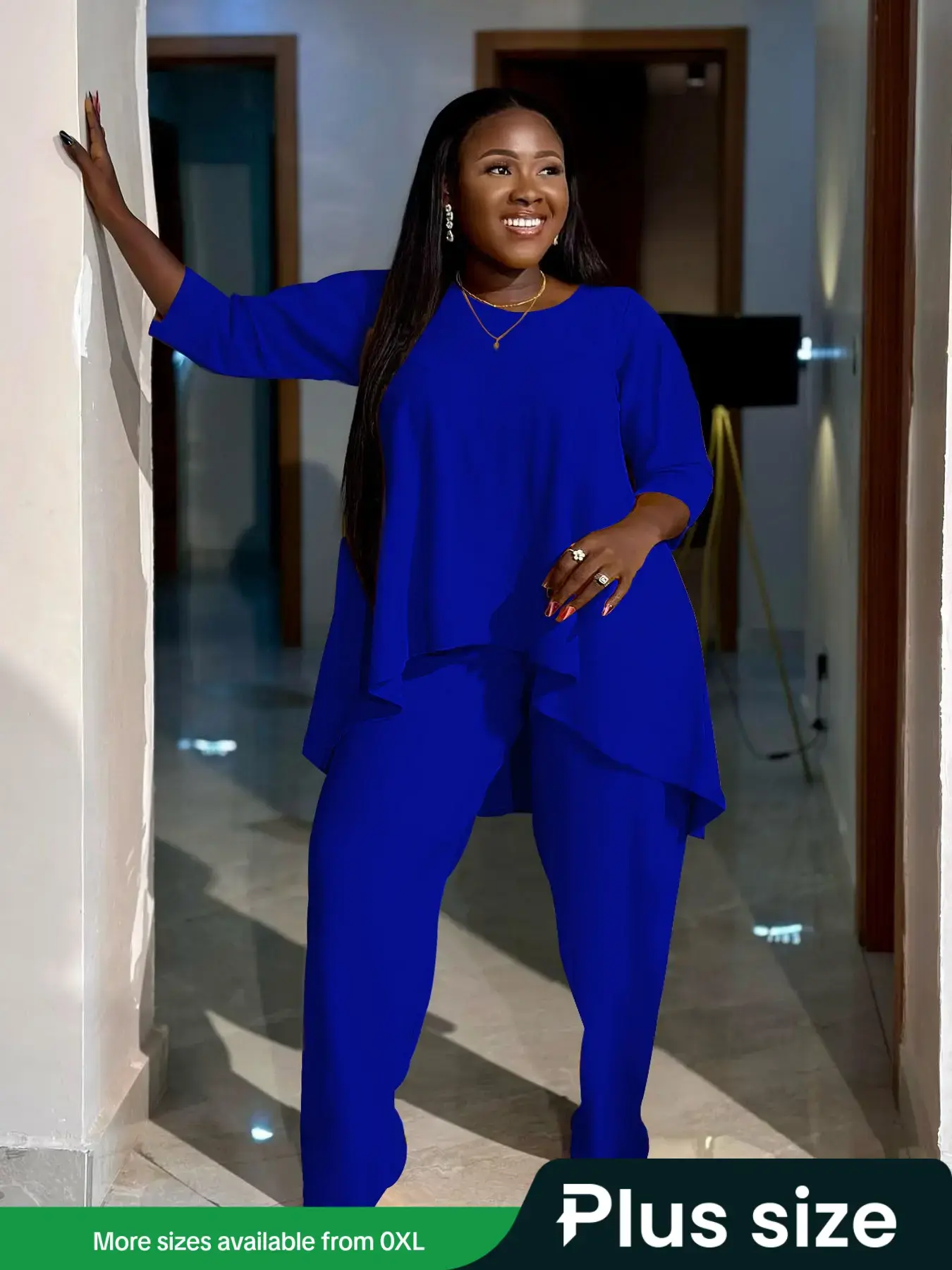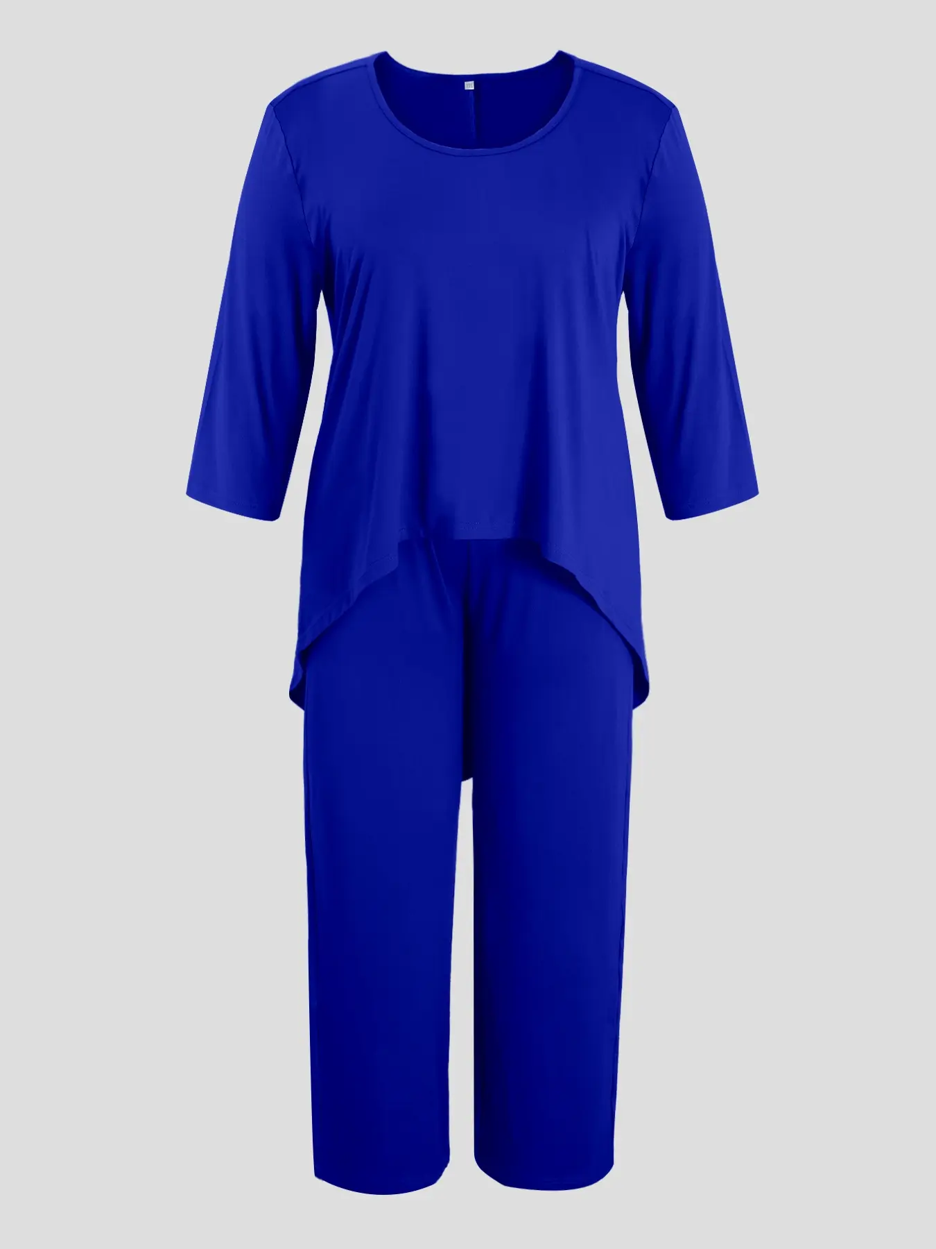 Plus Size Solid Round Neck Set, 2 Counts/set  Casual Cozy Long Sleeve High Low Tee & Pants for Daily Wear, Women's Outfits for Spring & Fall