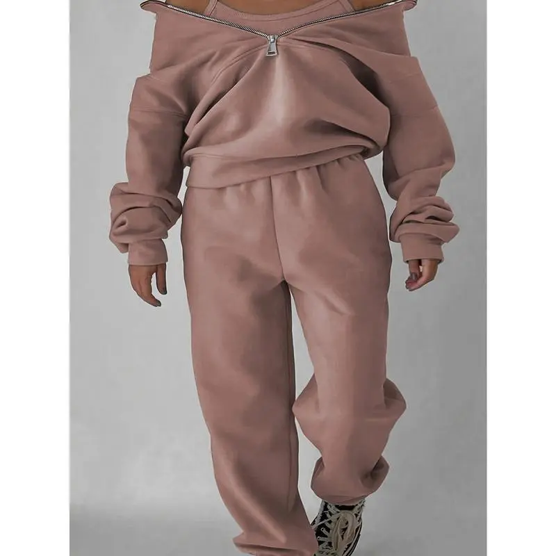 Plus Size Casual Solid Color Pants Set, Zipper Long Sleeve Sweatshirt & Pants Outfits For Fall & Winter, Women's Plus Size Clothing