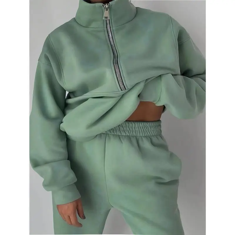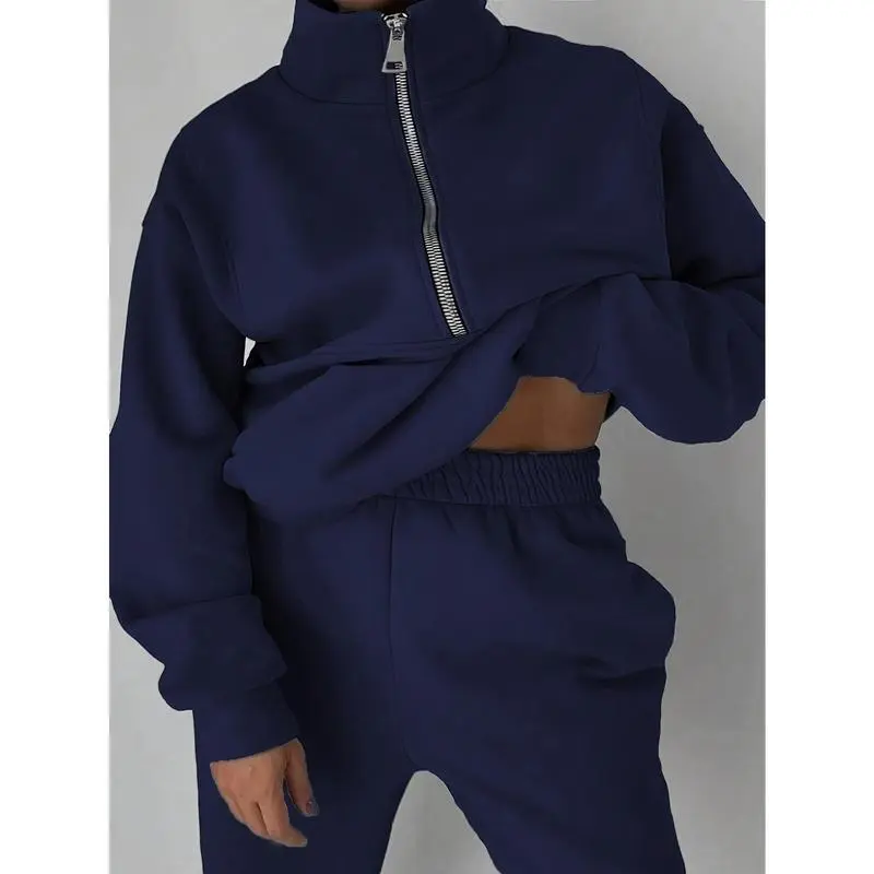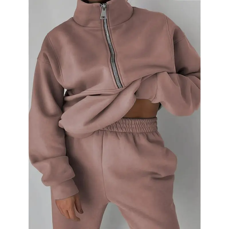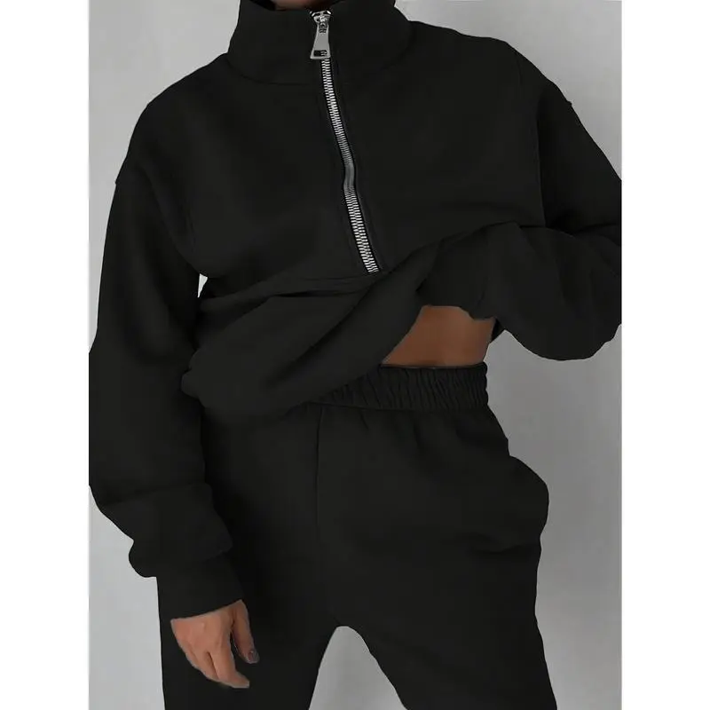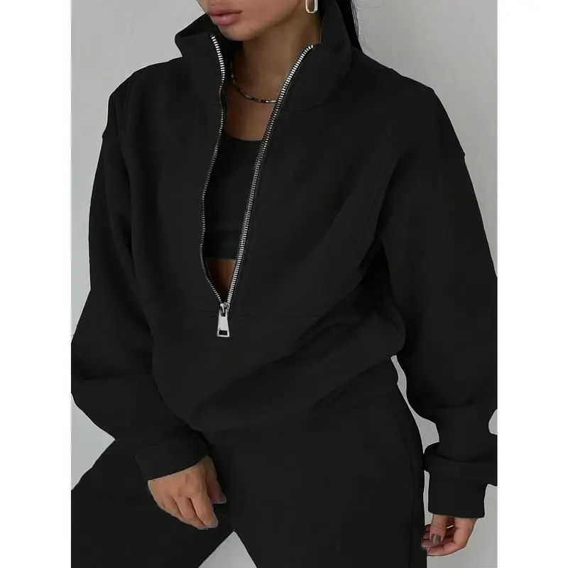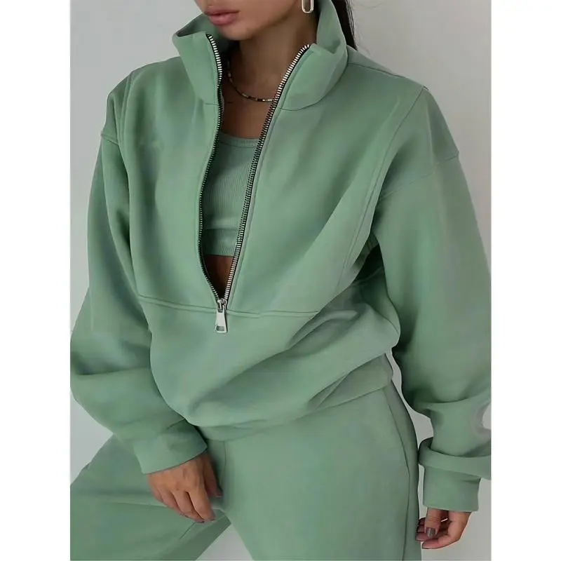 5. Plus Size Casual Solid Color Pants Set, Zipper Long Sleeve Sweatshirt & Pants Outfits For Fall & Winter, Women's Plus Size Clothing