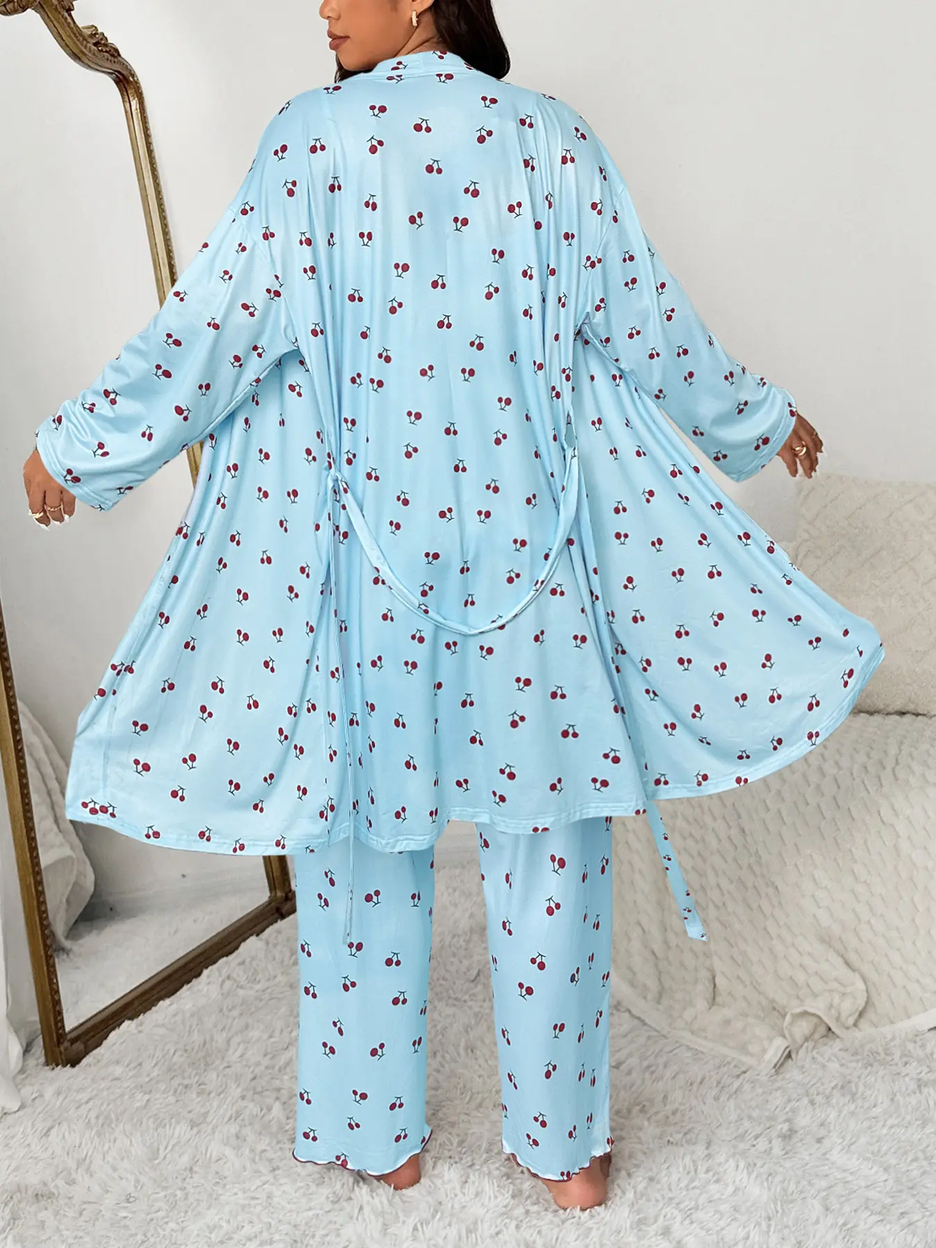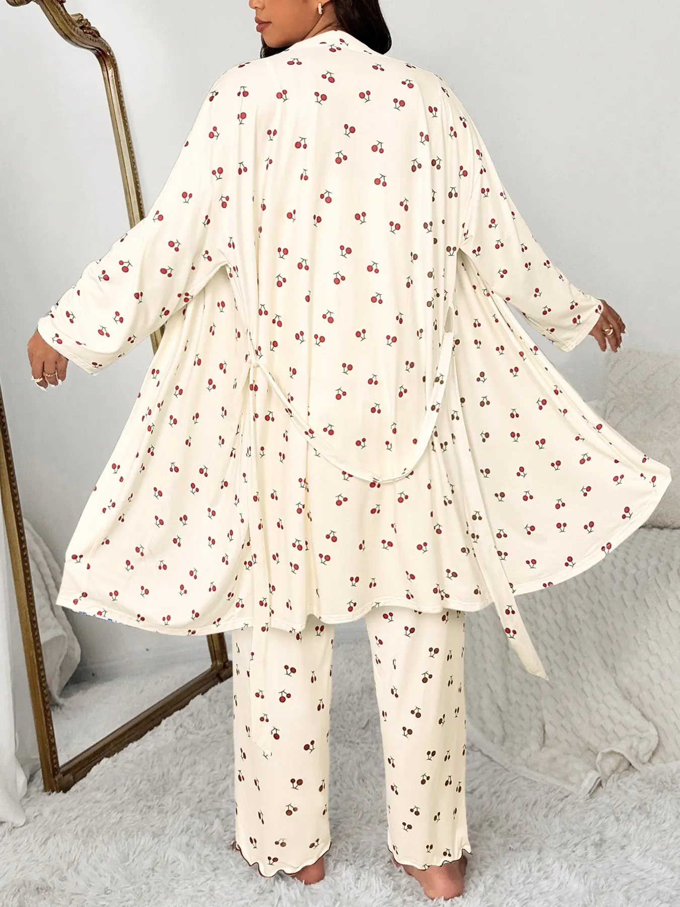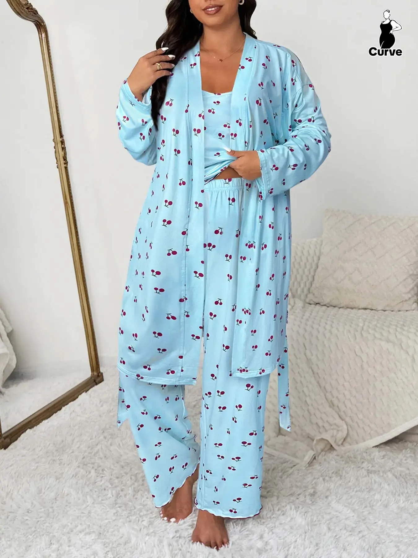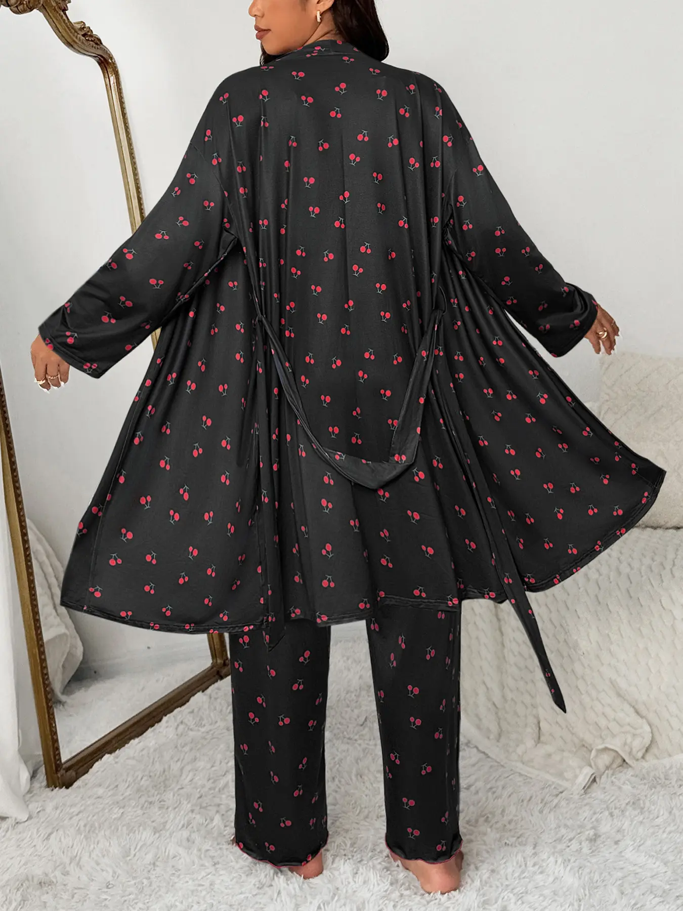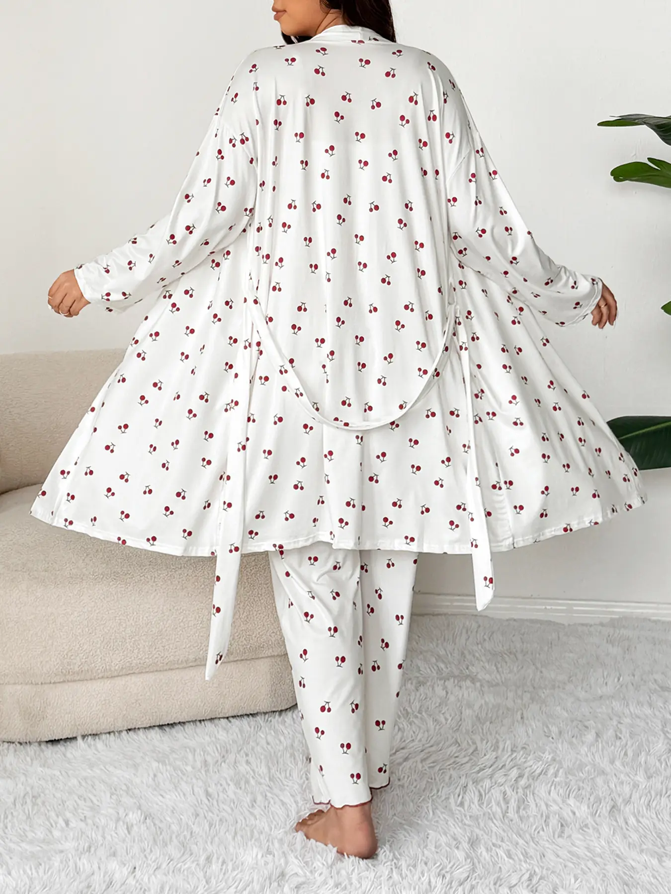 Women's Plus Size Cherry Print Sleeved Belted Robe Set, Three-Piece Pajama Sleepwear, Soft & Cozy Nightwear for Ladies #loungewear #womensloungewear #onsiepajamas #hanespajamas #silkpajama #winterloungewear #mensloungewear #cozyholidaypjs #comfortpajamas #womensjumpsuit