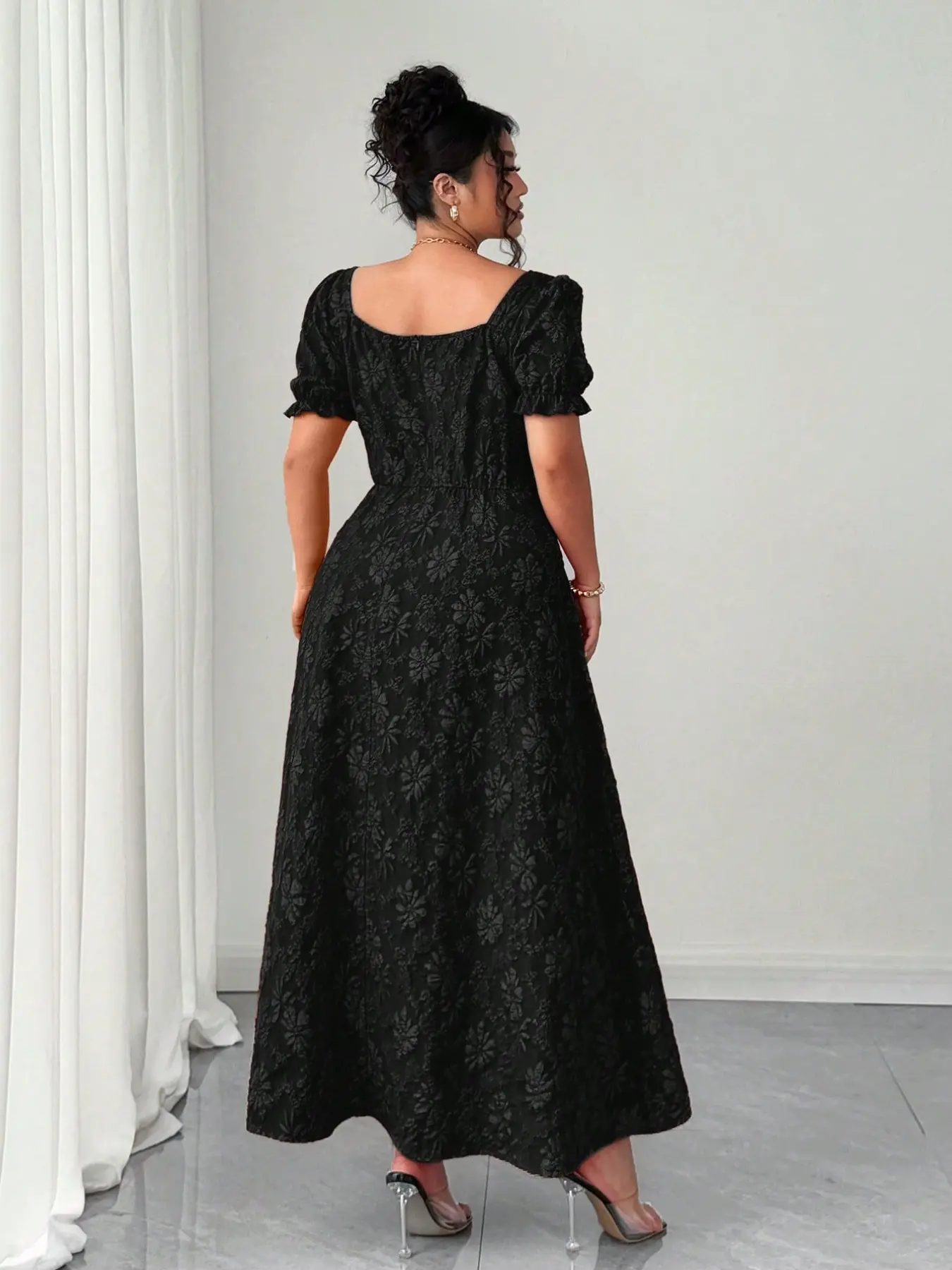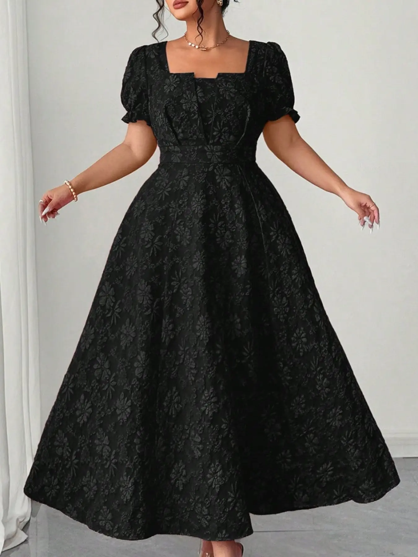 5. Plus Size Embroidered Square Neck Bubble Sleeve Belted A-Line Long Dress, Vintage Court Style, Elegant Women's Clothing