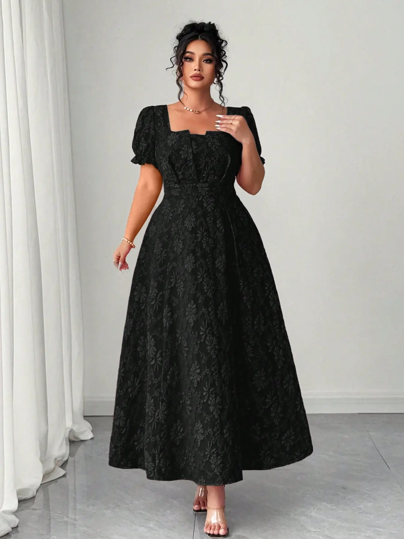 Plus Size Embroidered Square Neck Bubble Sleeve Belted A-Line Long Dress, Vintage Court Style, Elegant Women's Clothing