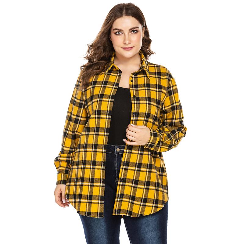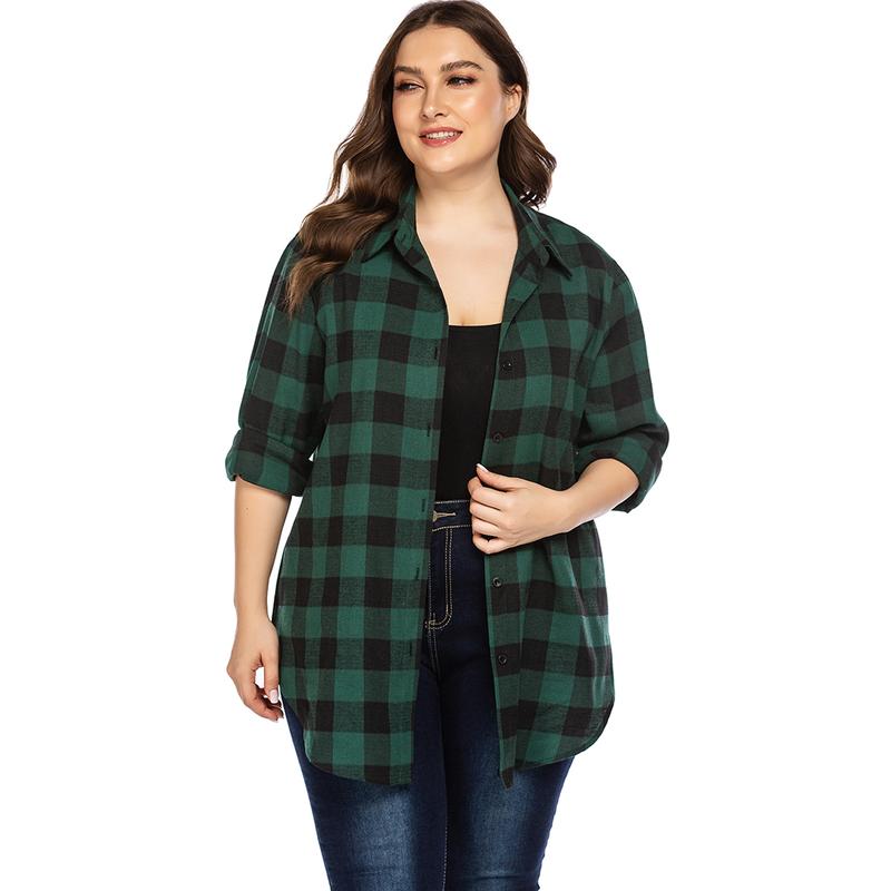 ·Plus size plaid shirt -plaid pattern/Mid-Long style/Collar Neck/ Long Sleeve/ Button Closure/curved hem.,Simple&Chic.Hand or Machine Wash Cold.