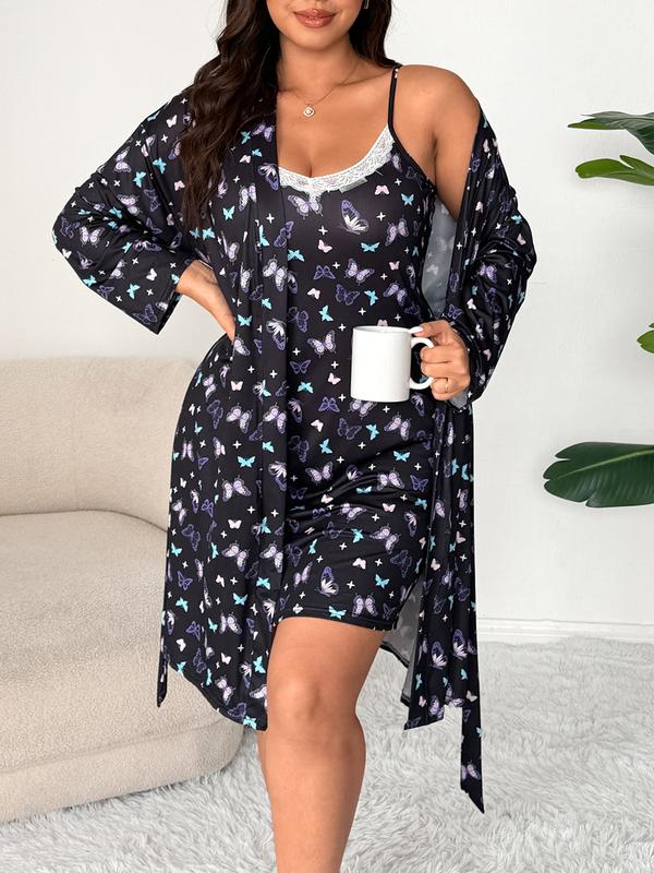 Plus Size Floral Butterfly Lace Dress & Long Sleeve Robe Set, Casual Fitted Home Wear, All Seasons Comfortable Sleepwear #pajamas #womenspajamas #usloungewearlooks #christmasloungewear #womenpajamaset #womenssweatshirtset #womensloungewear #girlspajamas #loungewearsets #prettygardensweatsuit