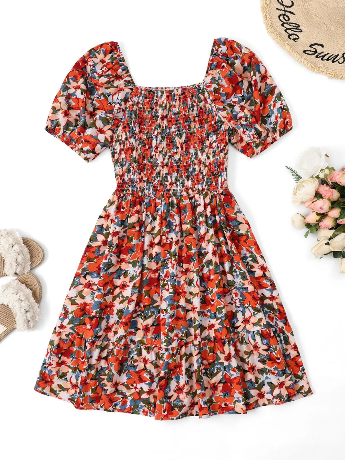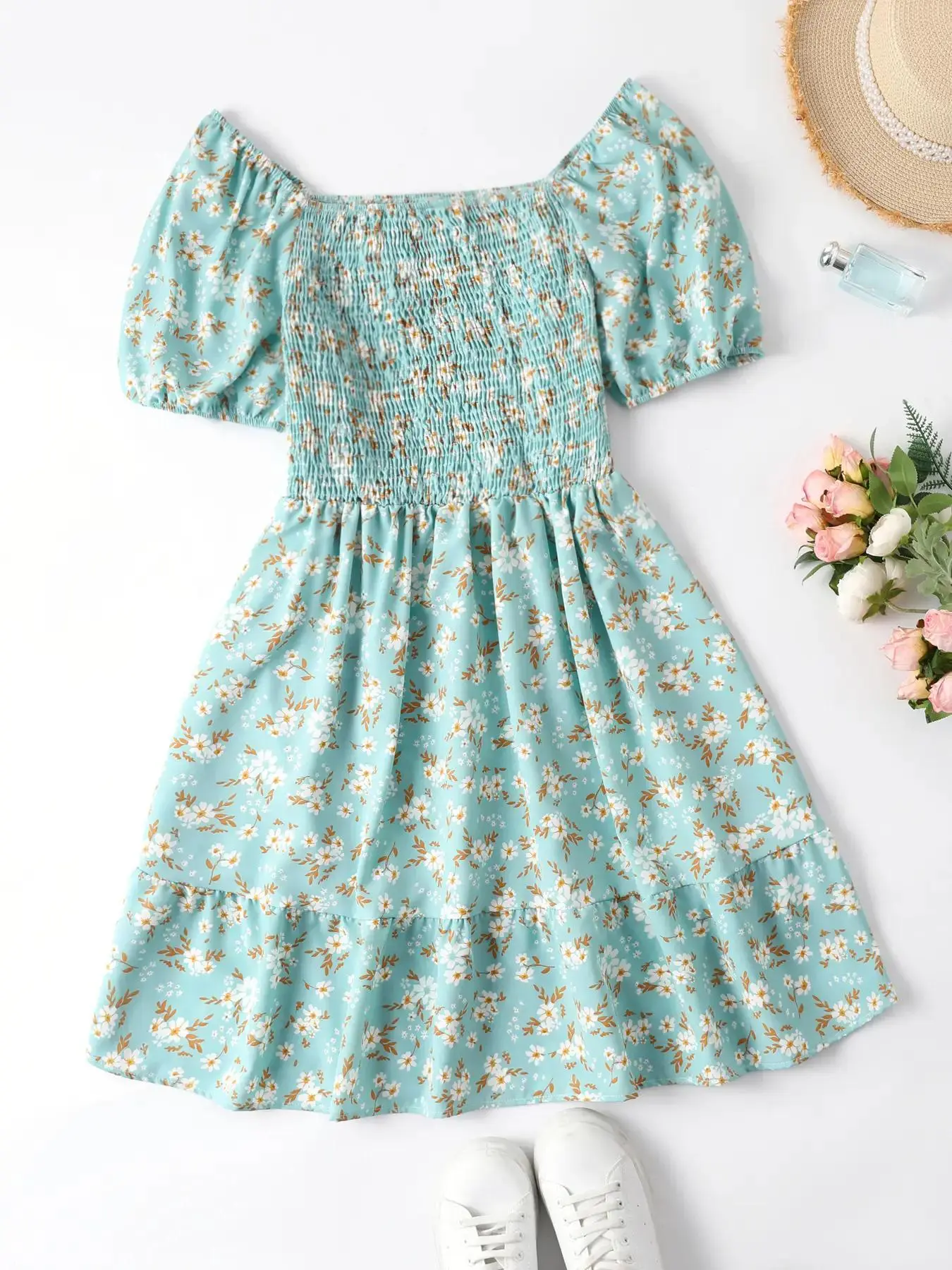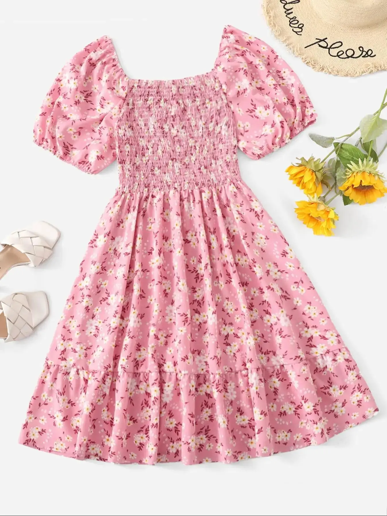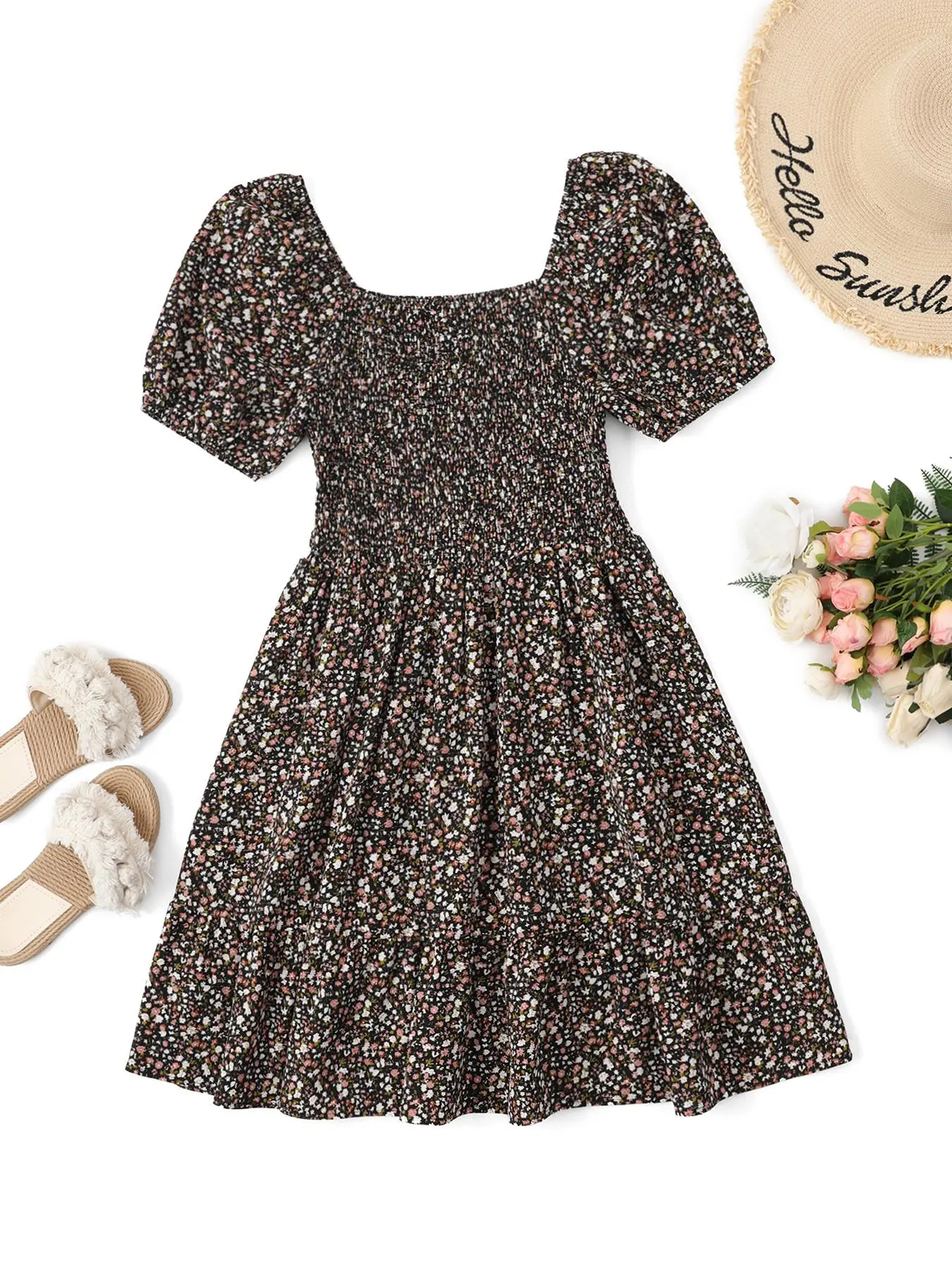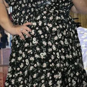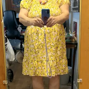 Beautiful bright yellow ditsy floral print tea length dress, nonwrinkling soft materials. I bought two short ones as I have several long versions of this dress. The wrinkles from just unpacking.