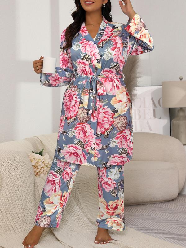 【Plus Size】 Three-Piece Set Floral Print Belted Lounge Robe & Cami Top & Elastic Waist Pants Pyjama Set, Drop Shoulder Long Sleeve Robe & Sleeveless Top & Bow Decor Trousers PJ Set, Women's Sleepwear for Fall, Nightwear Lounge Set, Matching Pj Set