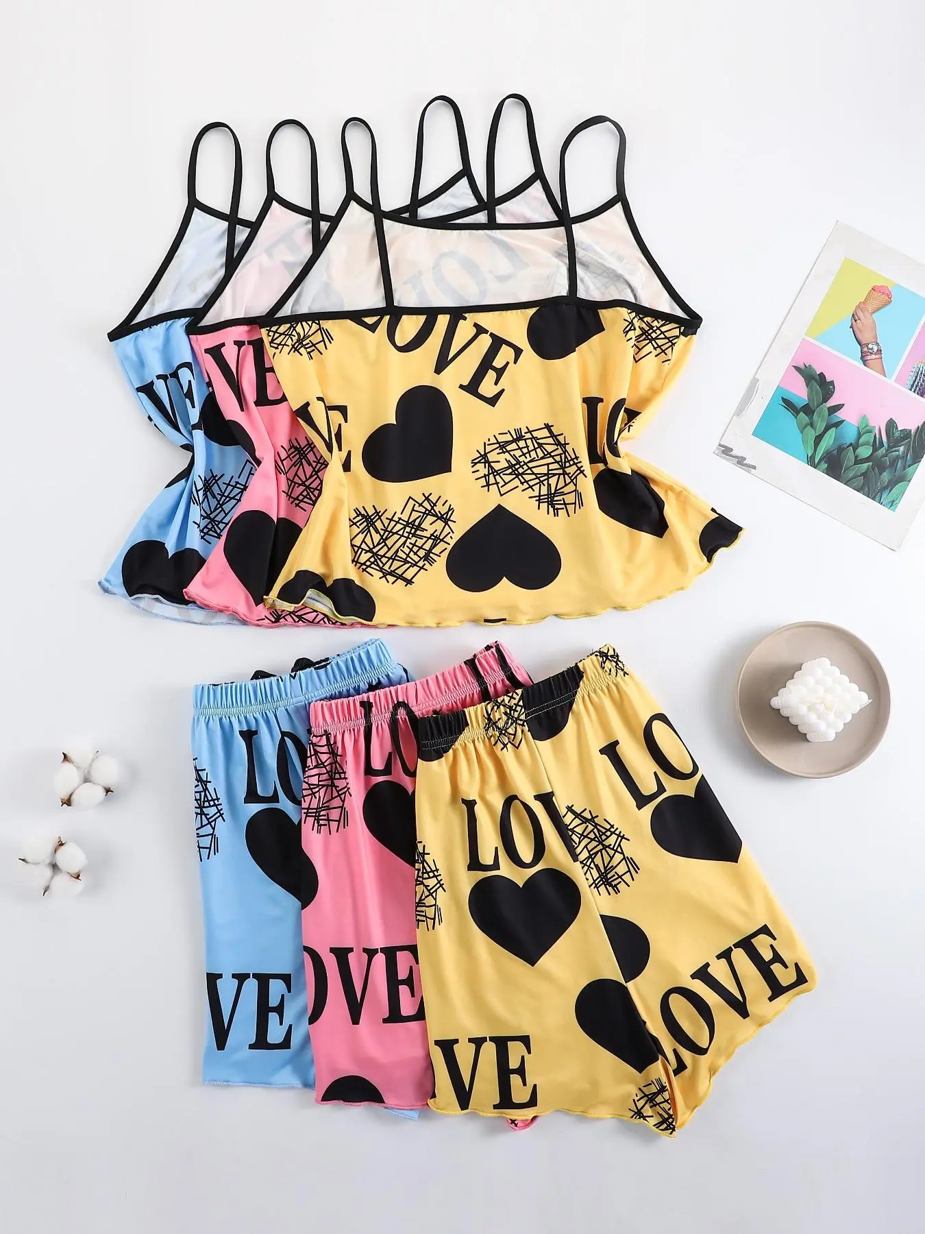 5. 6-Piece Plus Size Heart Letter Print Cami Spaghetti Strap Shorts Pajama Set, Casual Sleeveless Fitted Sleepwear, Elastic Waist Bow Design, All Seasons