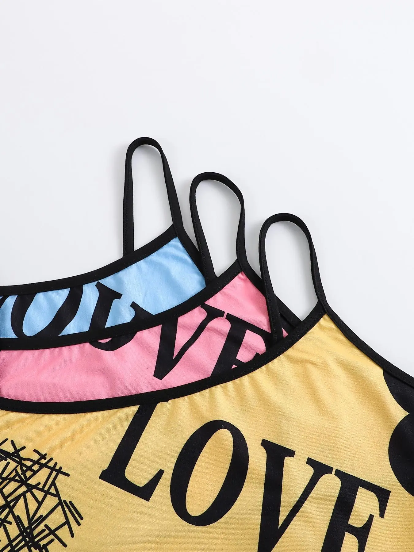 6-Piece Plus Size Heart Letter Print Cami Spaghetti Strap Shorts Pajama Set, Casual Sleeveless Fitted Sleepwear, Elastic Waist Bow Design, All Seasons