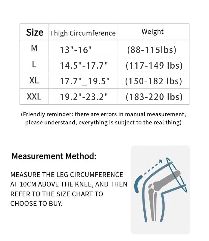 Size guide lacks info since it only provides size for a medium brace. XXL barely fit my thunder thighs. Overall, the shipping time was awesome and the product is well made and heavy duty.