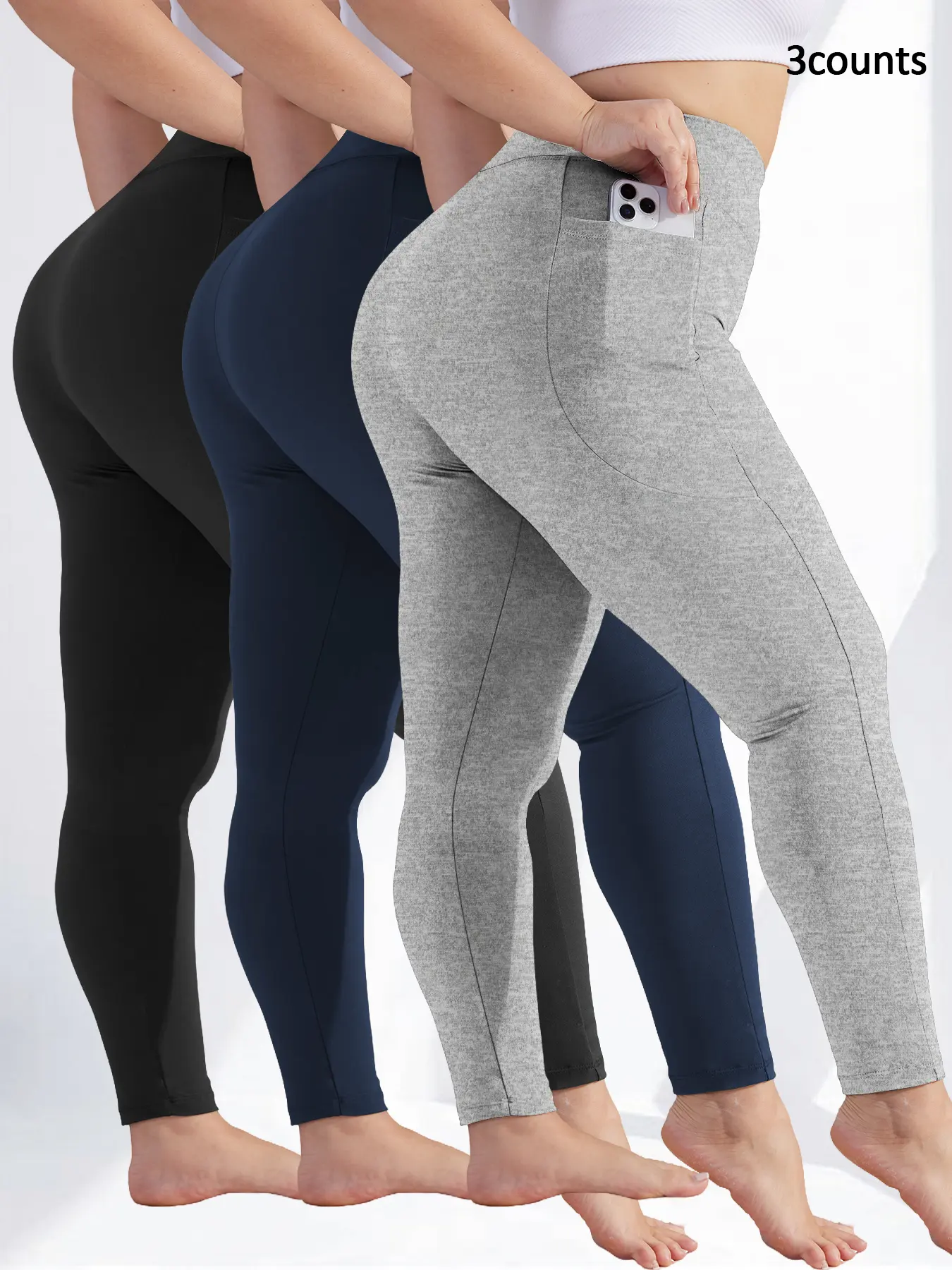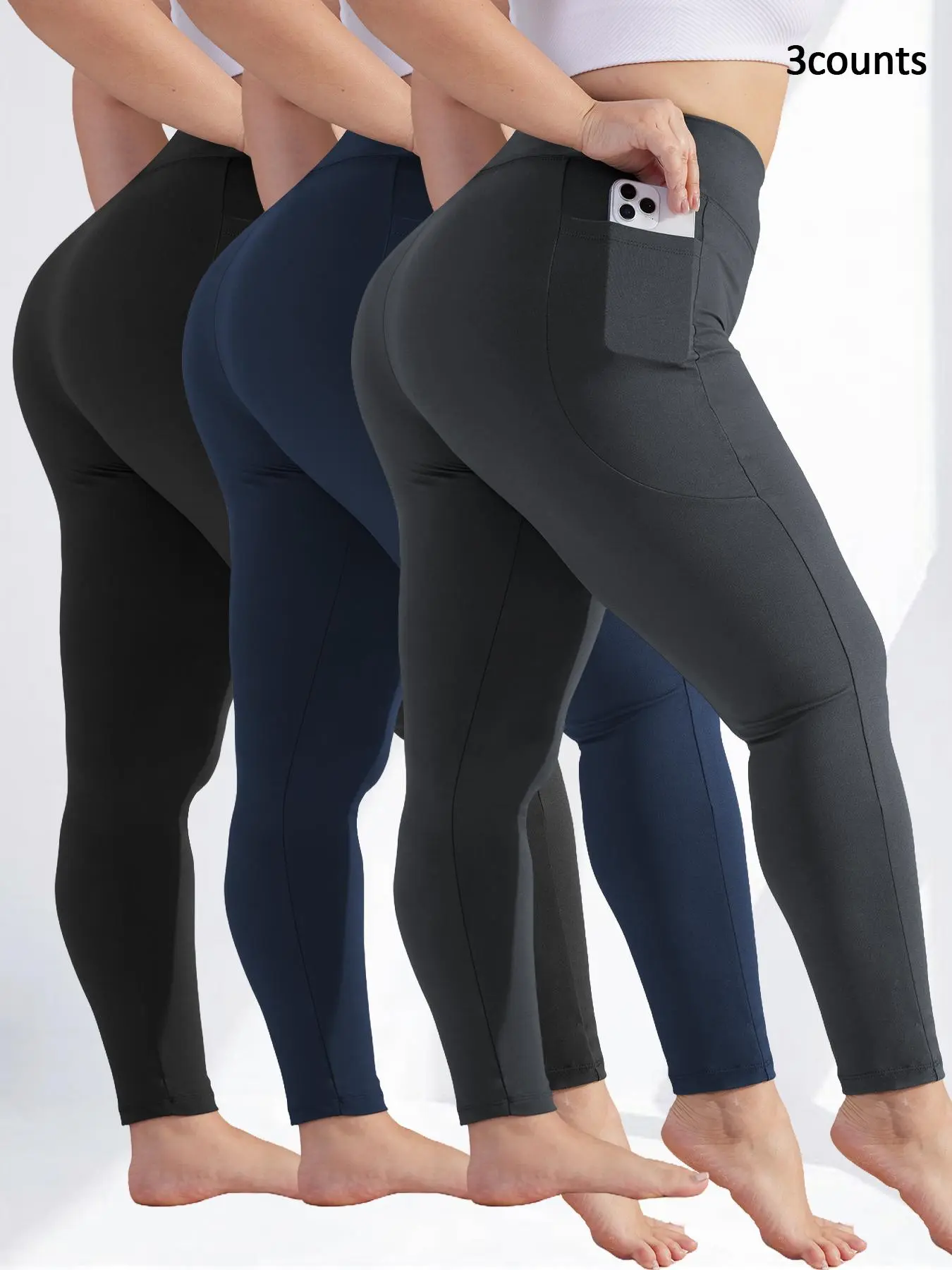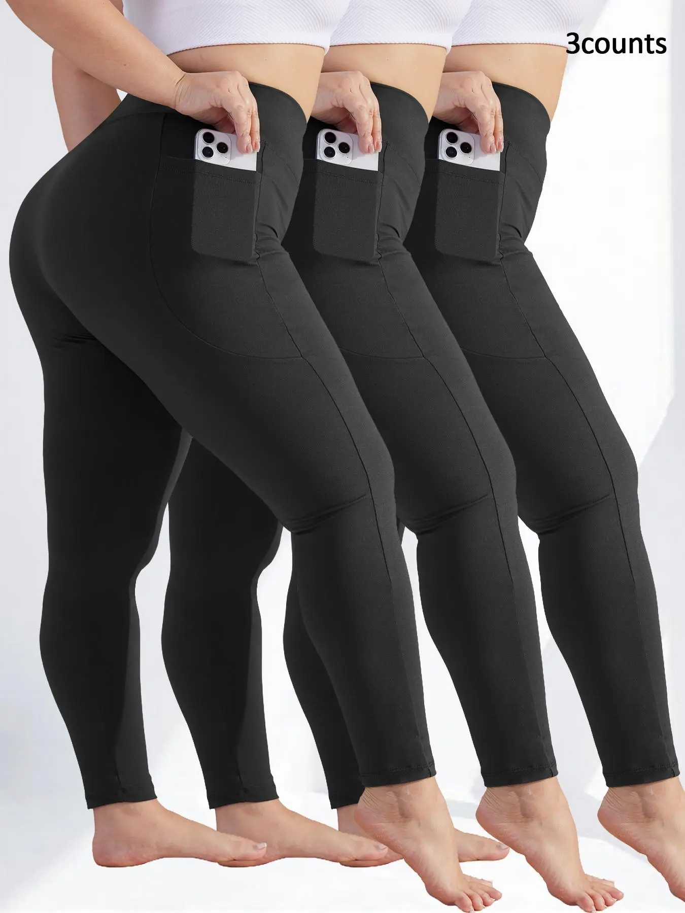 5. Plus Size Solid High Waist Fitted Leggings with Pockets, High Elastic Four-Way Stretch, All-Day Comfort Fit, 3-Pack Fashionable & Versatile Leggings