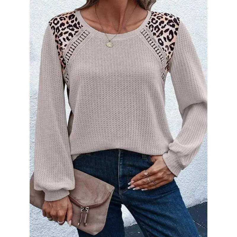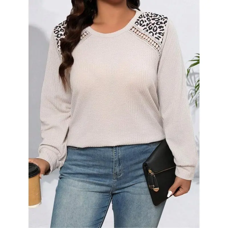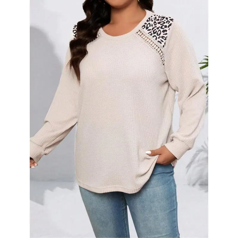 Plus Size Leopard Print Patchwork Round Neck Knit Sweater, Casual Long Sleeve Crew Neck Jumper for Spring, Women’s Plus Size Clothing for Everyday Wear, Hoodie