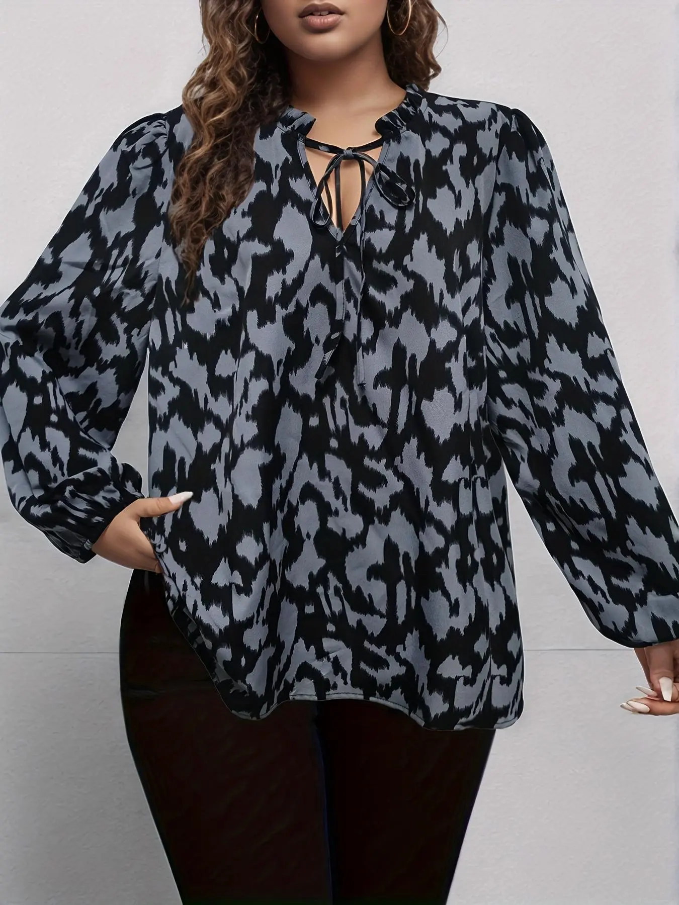Grey - Black Printed Tie - Neck Top? Chic Patterned Flair Unleashed#PrintedTrend #WorkwearChic #PlusSizeFashion #OfficeStyle