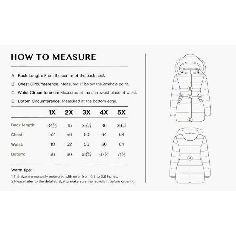 ·AGAINST FOR COLD--This plus size full-length coverage coat is padded with fluffy insulation. The hood and elastic rib cuff also has good windproof performance in chilly day.