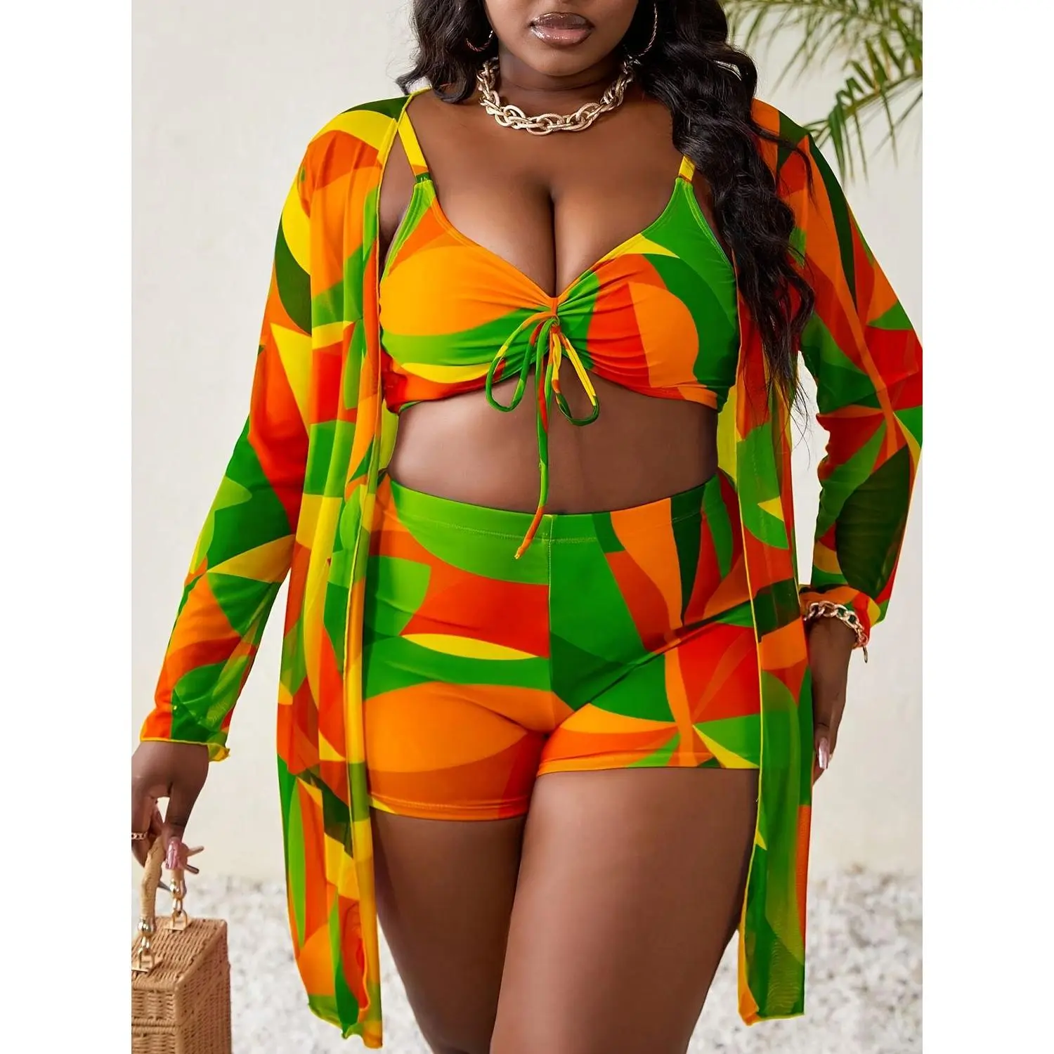 ✨ Upgrade your beach look with this Plus Size Multi-Color Patchwork Printed V-Neck Camisole Boxer Shorts set. This three-piece swimsuit is perfect for slim fit coverage, ideal for women's beach vacations. The vibrant patchwork design adds a playful touch to your outfit. 🌴