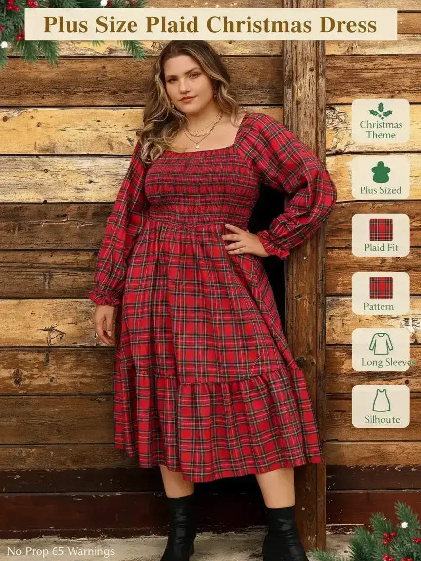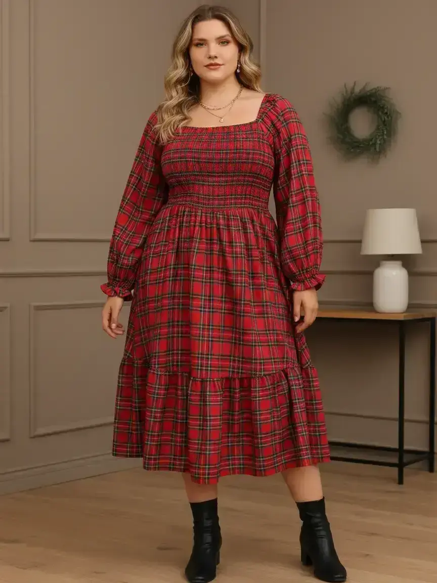 CHRISTMAS DRESS FOR PLUS SIZE WOMEN! CHRISTMAS PLAID DRESS OUTFIT!  Confidence looks good on you 💃✨ This plaid A-line dress flatters every curve and feels as good as it looks — soft, stretchy, and so festive! #Christmasdress #falldresses #Christmasoutfit #Plaiddress #Holidaydress