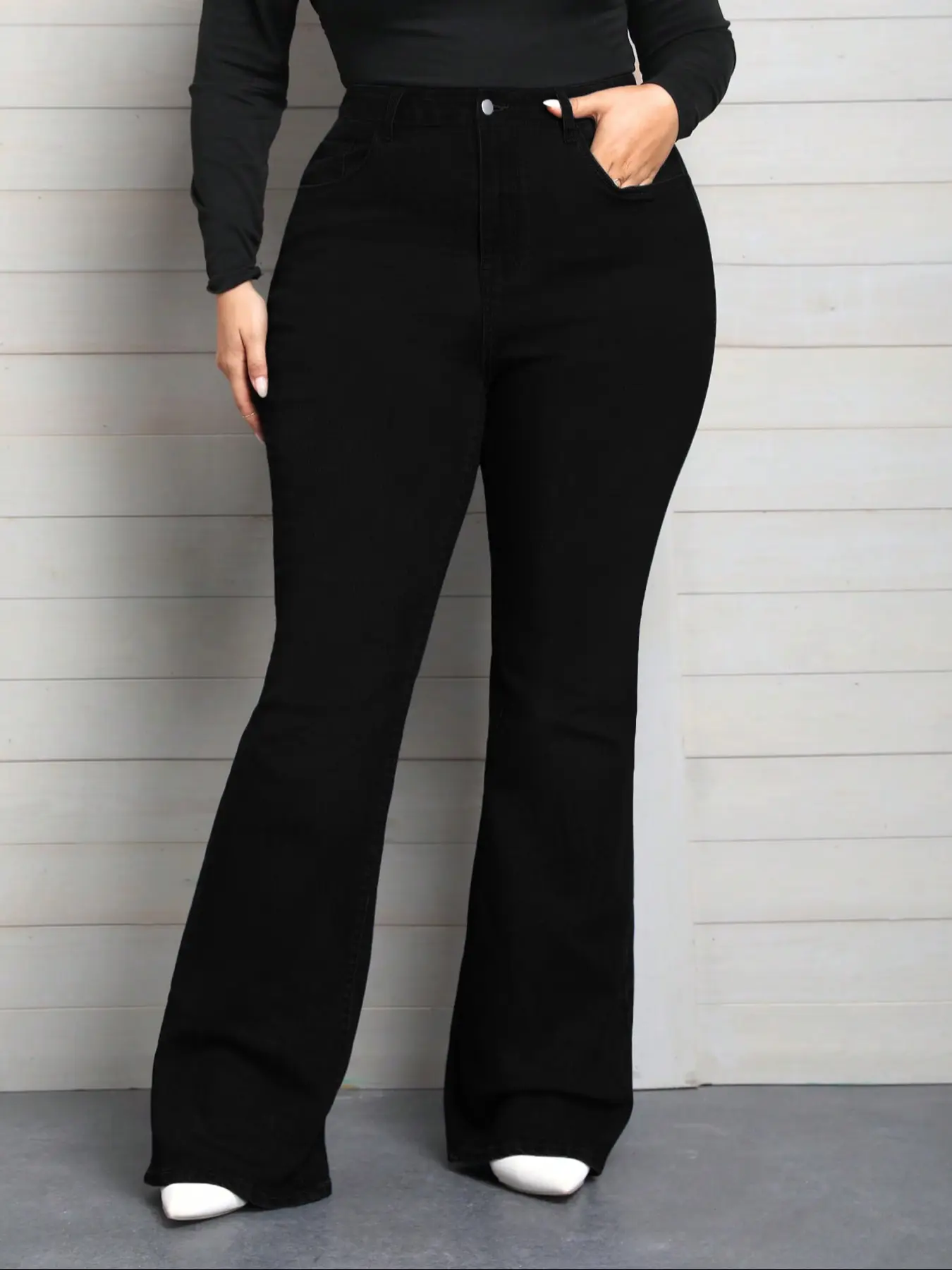 5. Plus Size Pocket Flare Leg Jeans, Casual Button Fly Bell Bottom Cotton Denim Pants, Women's Bottoms for Daily Wear