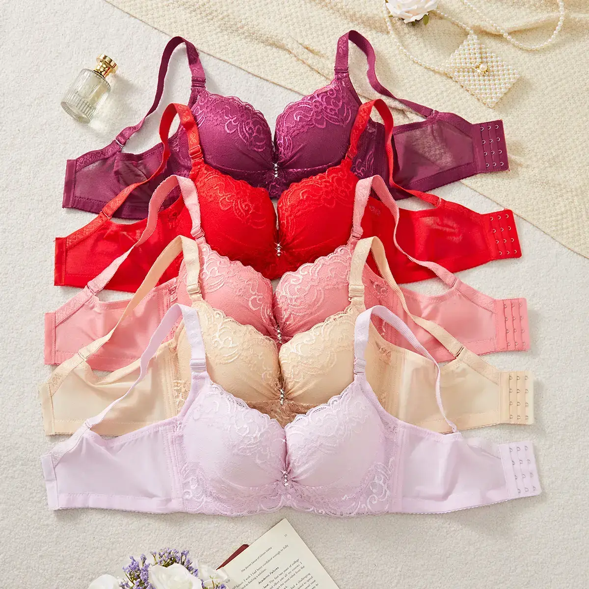 Plus Size Solid Color Lace Bra Women’s Lingerie for Daily Wear Breathable Adjustable Strap Push-Up Bra 38C–46C Minimalist V-Neck Basic Black Burgundy Big Red Pink Apricot Women’s Fashion Casual