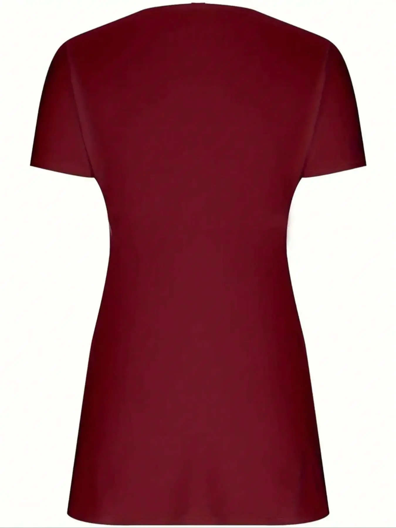 This top didn’t work for me. It was very low-cut in the front & came down below my bra. It’s very thin fabric, so it would be great for summer. Did return bc of the design in the front. I couldn’t even pin it closed and have it look good. The color was more of a deep rose, not burgundy. Easy return.