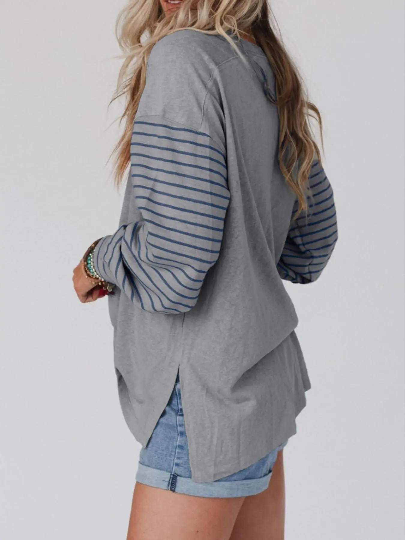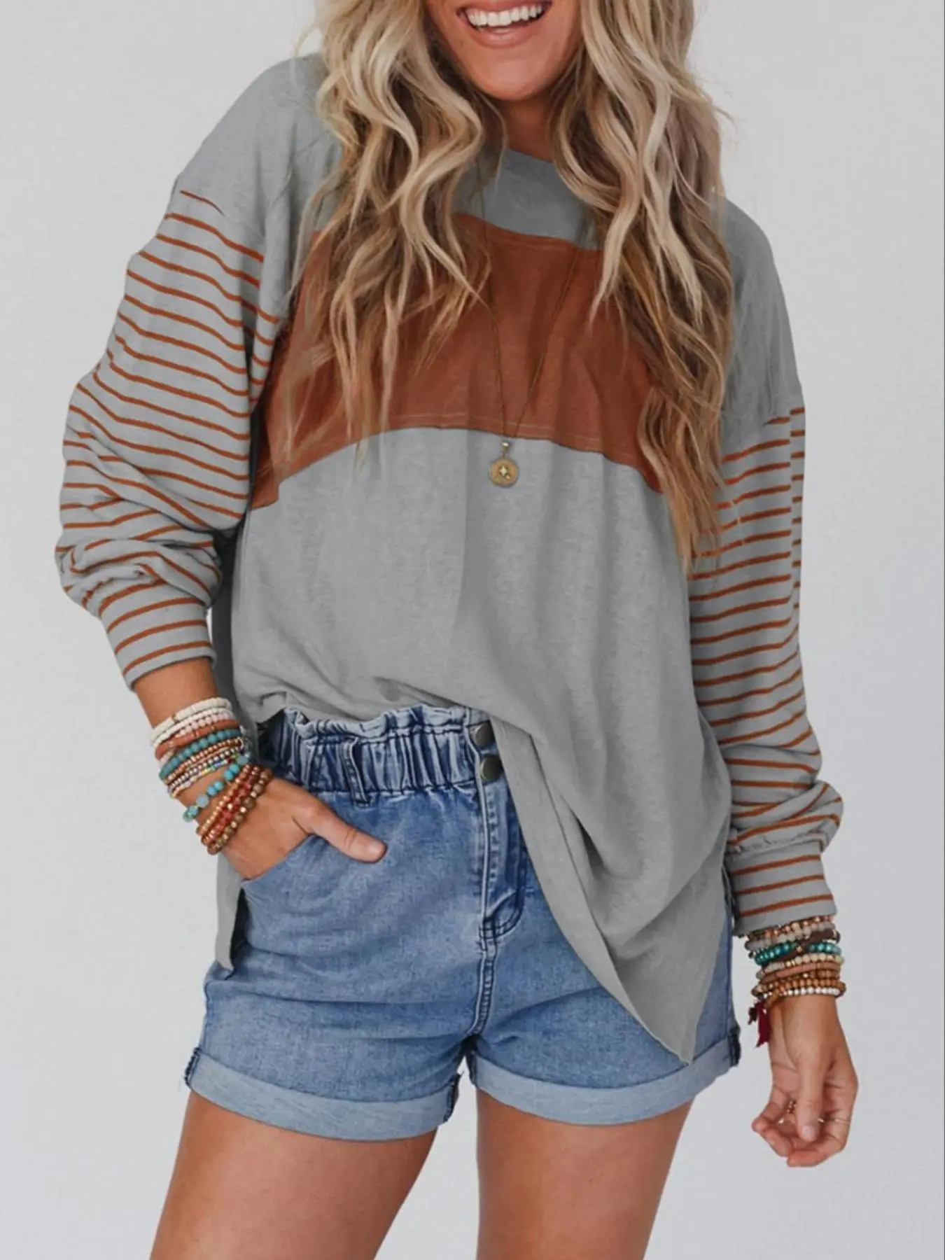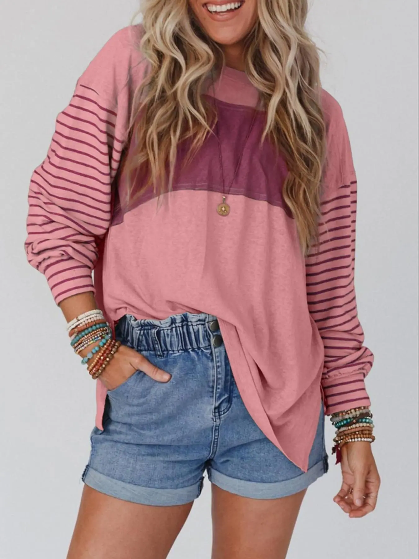 5. 【Plus Size】 Striped Crew Neck T-shirt, Casual Long Sleeve Top for Spring & Fall, Women's Plus Size Clothing for Daily Wear
