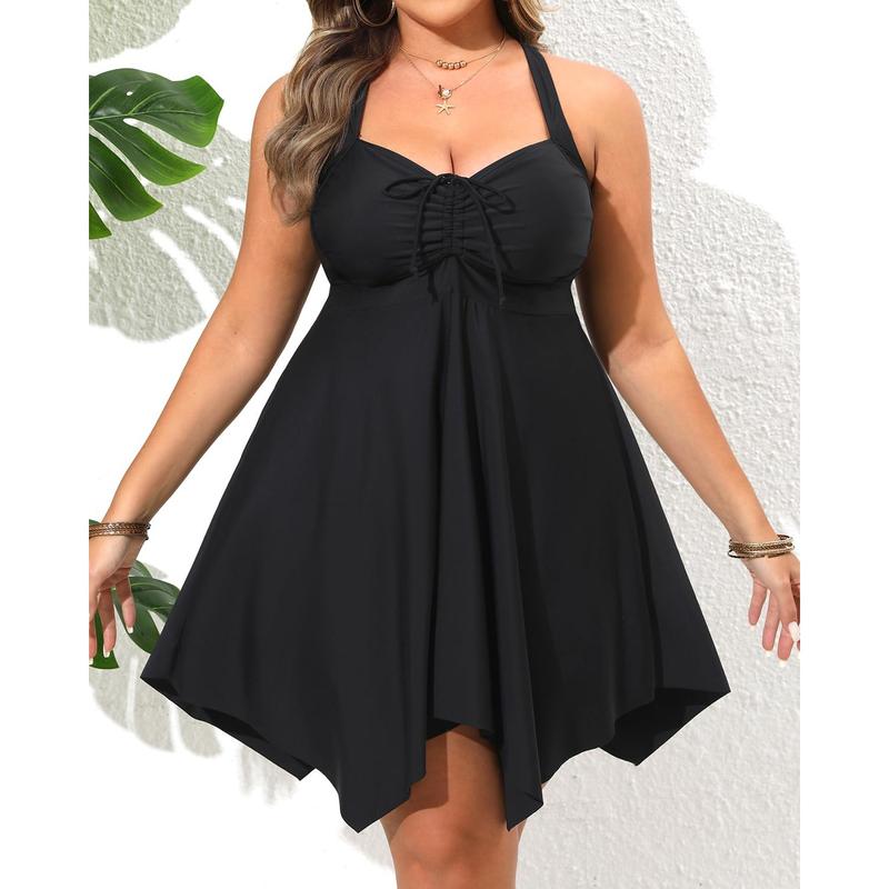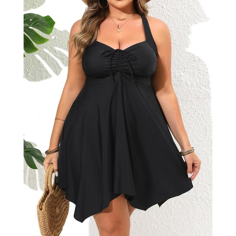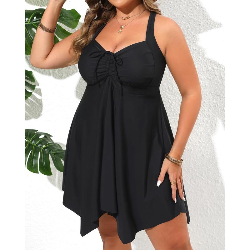 ·Introducing our stylish plus size two piece swim dress with shorts for women. This slim two piece swimdress features a sexy cross-back design, and the retro elegant skirt has an irregular hem that adds a touch of sophistication to your beach look.