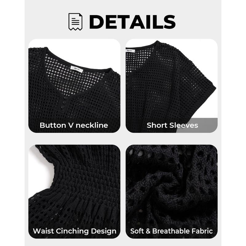 ·Plus Size Swimsuit Cover Up: The crochet cover up features short sleeves, a buttoned V-neck as decoration on the collar, and a waist-cinching design for a chic, flattering look.