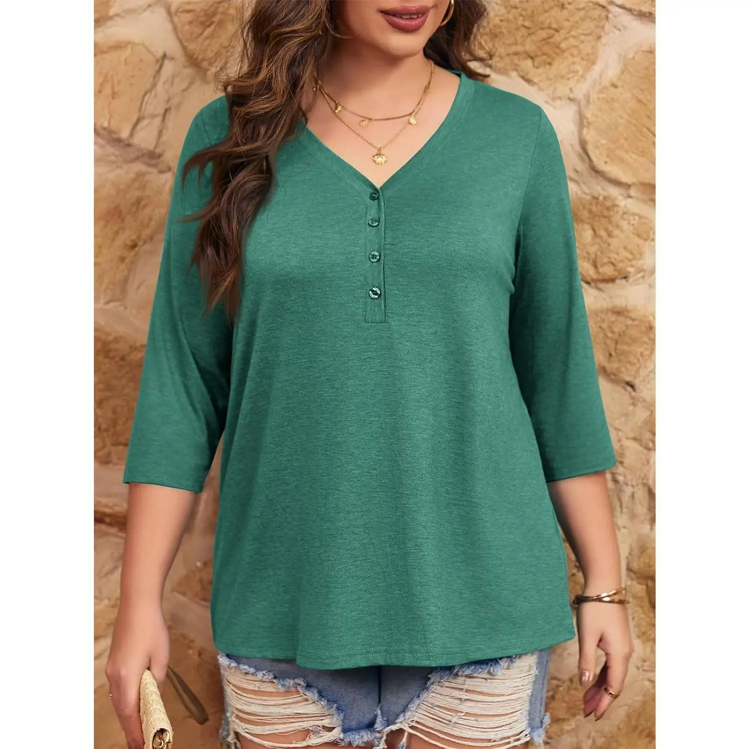 🌟【L-5XL】Imily Bela Curve Womens 2025 Plus Size Tops V Neck 3/4 Sleeve Casual T shirts Loose Basic Tunic Tees Summer Vneck