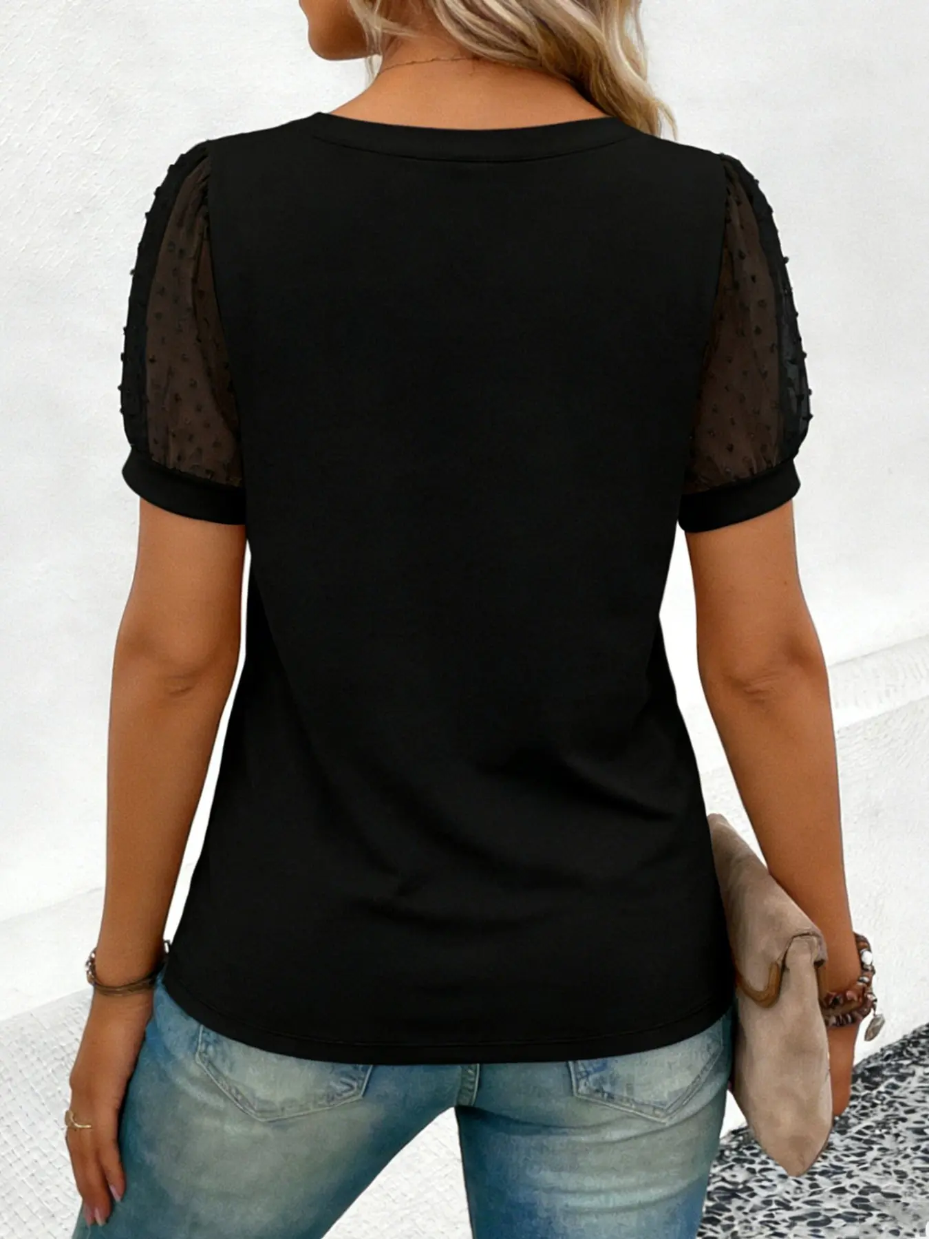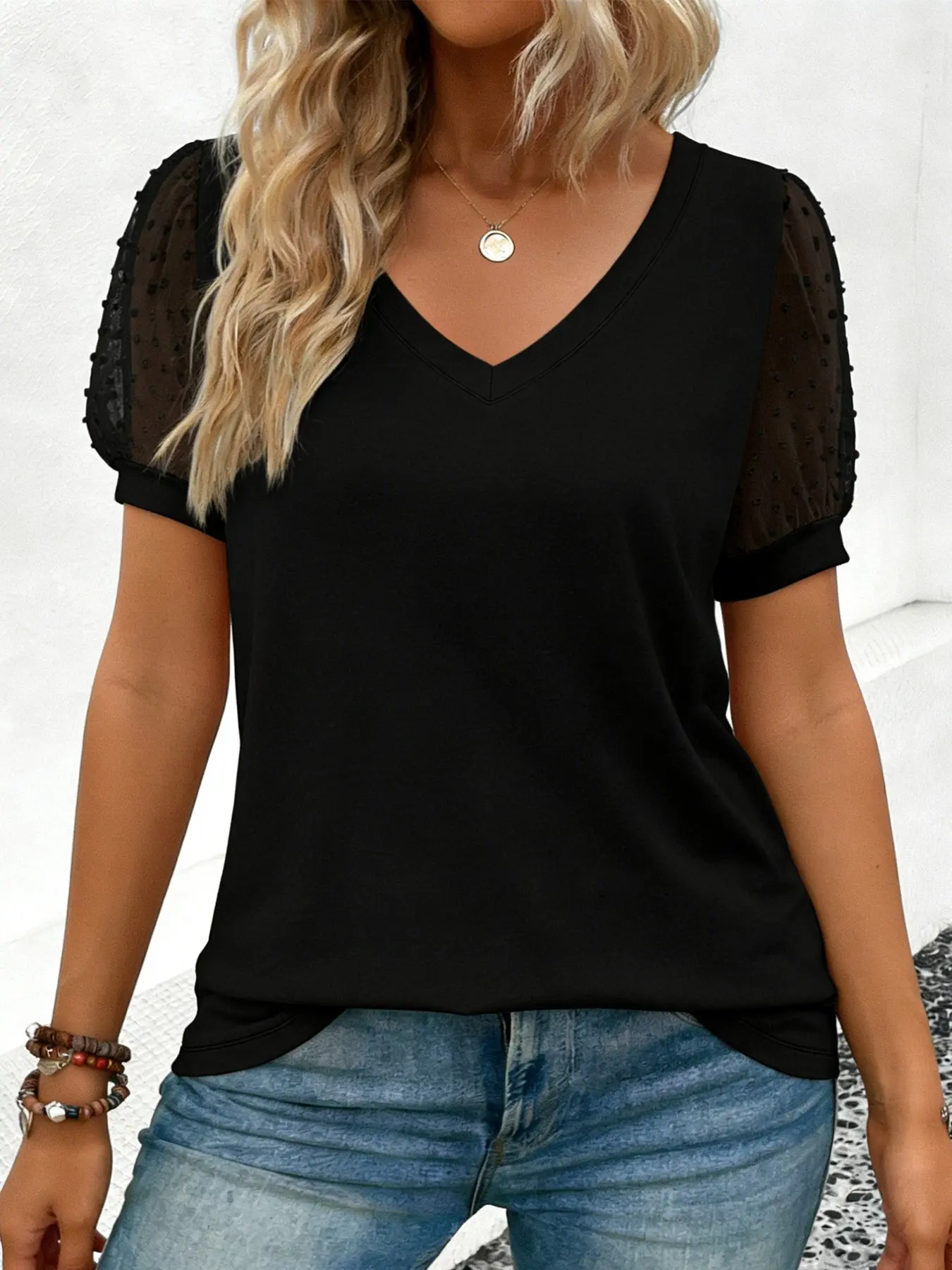 5. Plus Size Solid Color V-Neck Sheer Puff Sleeve Top Shirt – Casual Loose-Fit Polka Dot Mesh Sleeve Blouse, Trendy Daily Street Style Outfit, Summer Vacation Matching Jeans, Y2K Aesthetic Clothes, Office Work Wear