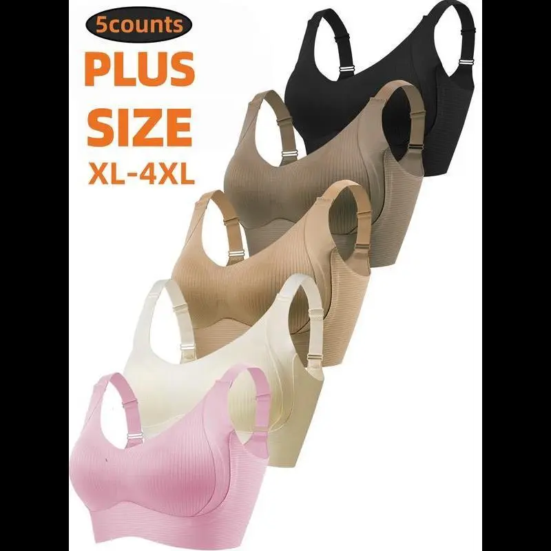 【Wireless Support】: This bra features a wireless design, providing gentle support without the discomfort of traditional underwire./【Full Coverage Cups】: Enjoy full coverage with our cups, designed to enhance your shape while offering maximum security throughout the day./【Five Pack Value】: Each purchase includes five bras, a practical choice for those who prefer to have multiple options readily available./【Lined Interior】: The lined interior ensures a smooth feel against the skin, enhancing the wearing experience across all seasons./【Wide Size Range】: Available in sizes 1XL to 4XL, catering to a diverse range of body types for a better fit.