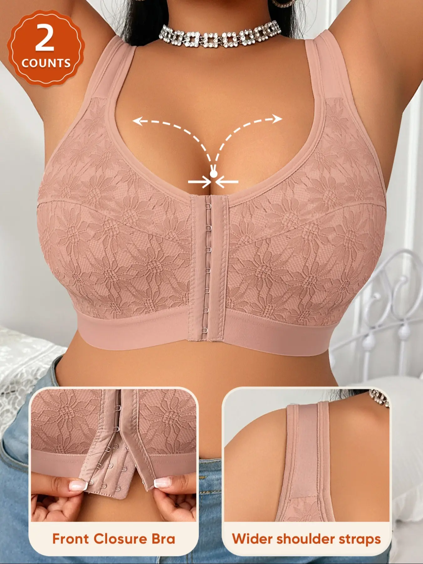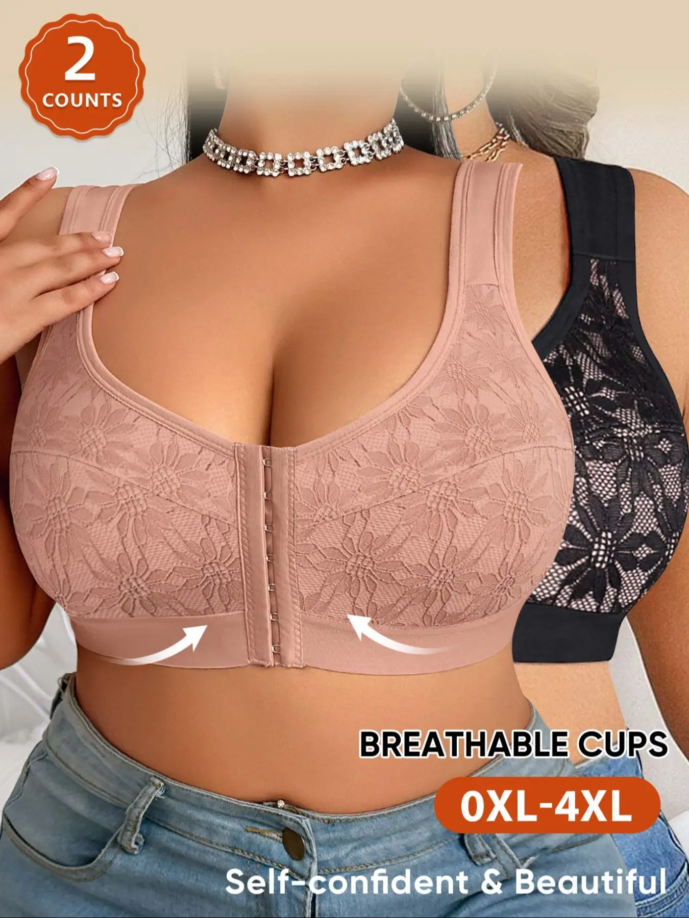 2 Pack Plus Size Women's Everyday Bras, Full Coverage Soft and Breathable Thin Cup, Front Closure Push Up Underwear for All Seasons