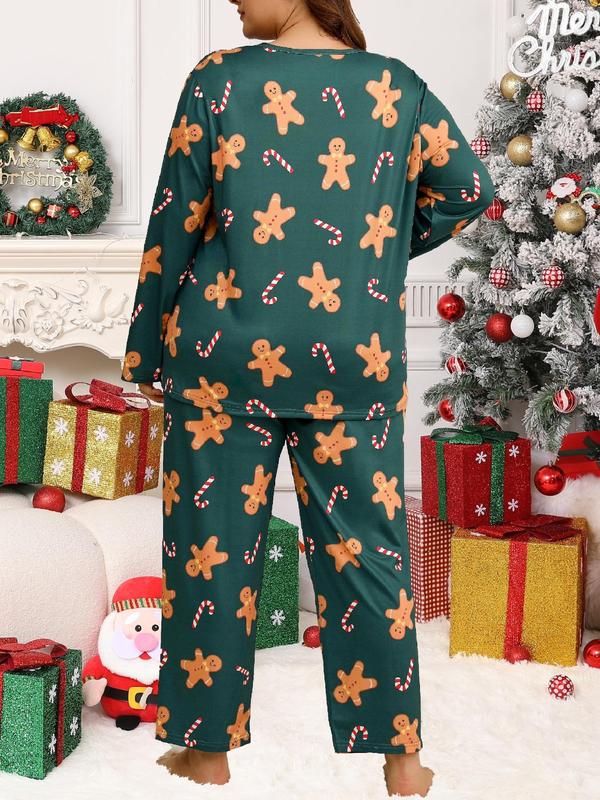 Plus Size Women's Christmas Pajama Set, Santa Claus Print, Snowflake & Gingerbread Man Design, Long Sleeve Comfortable Everyday Sleepwear
