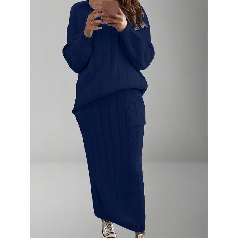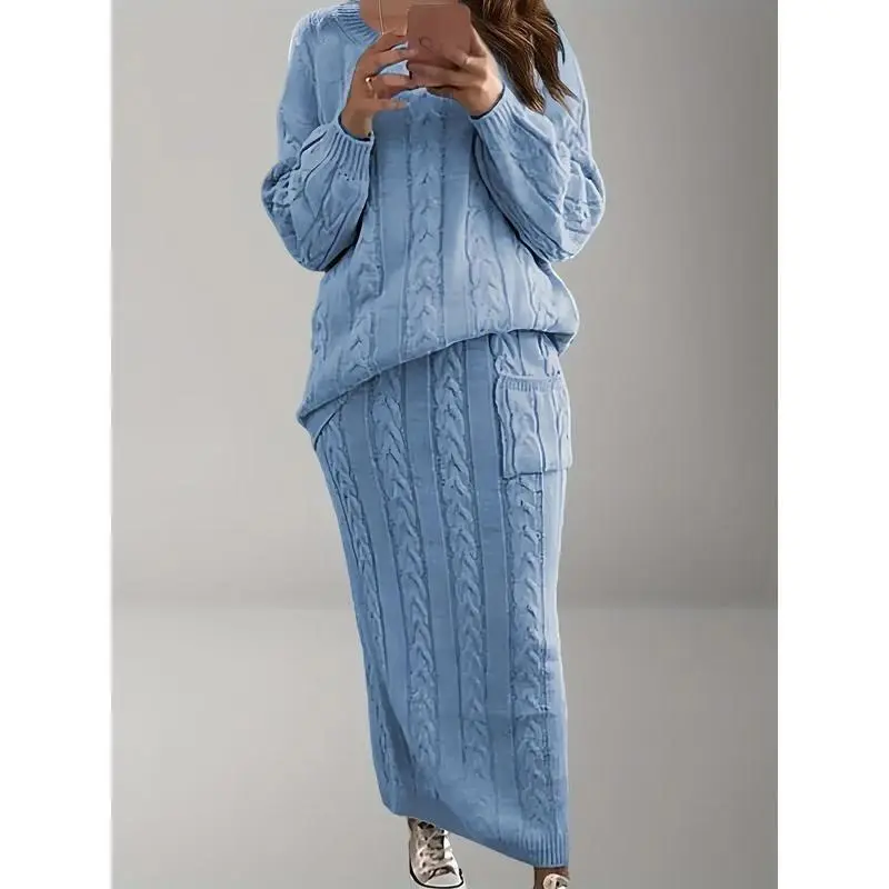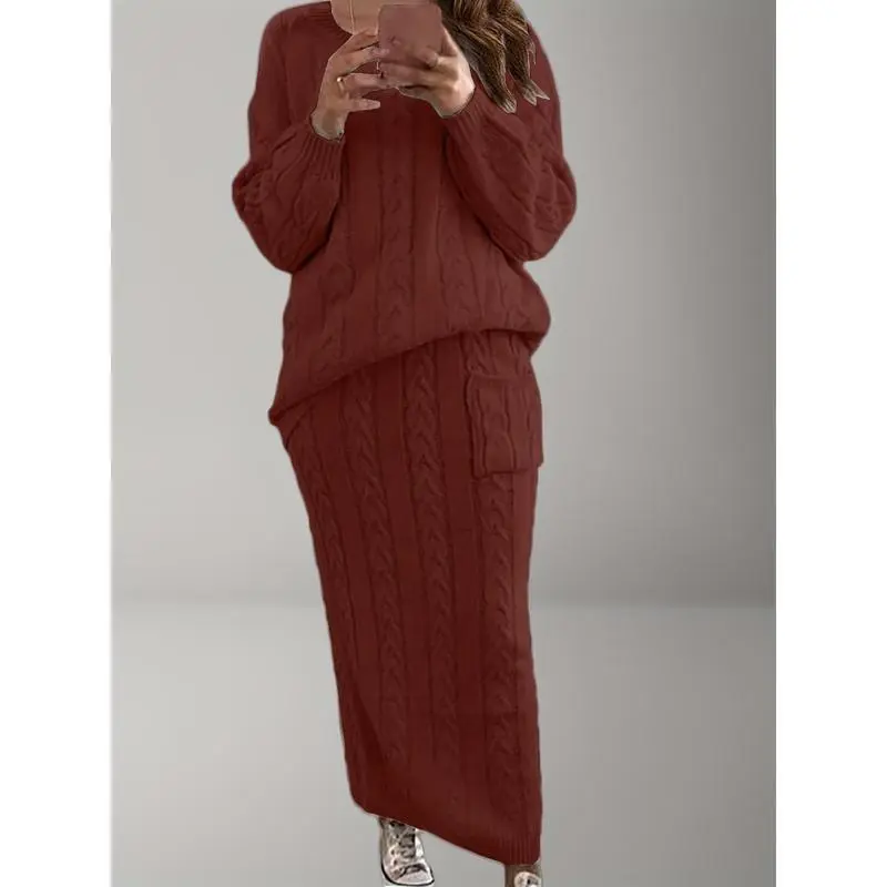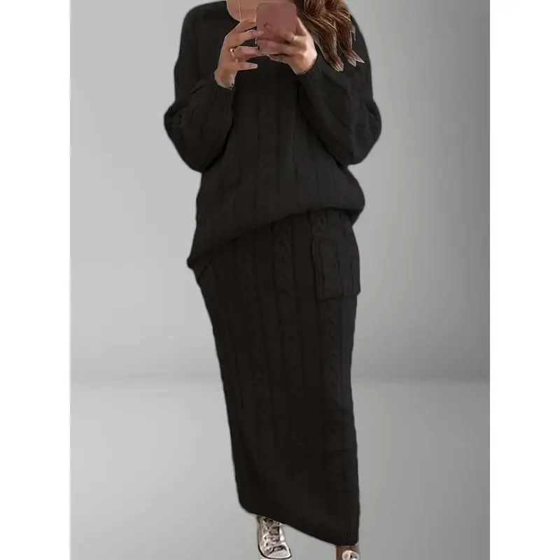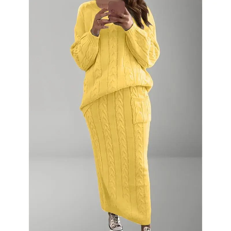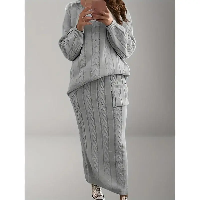 Plus Size, "Plus Size Women's Dress Set for Fall And Winter - Solid Color Cable Bodycon Skirt + Casual Loose Round Neck Sweater for A Chic Sweet Look!"