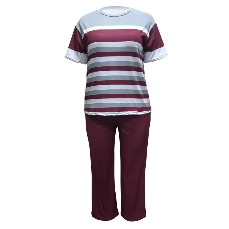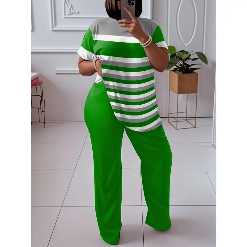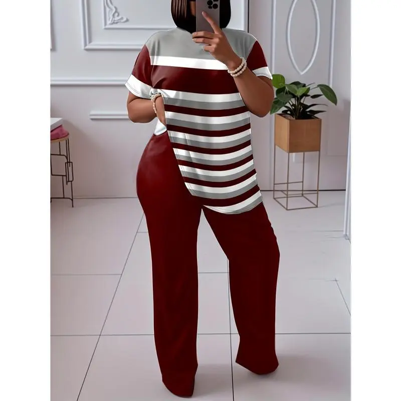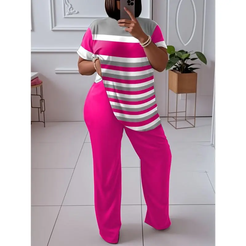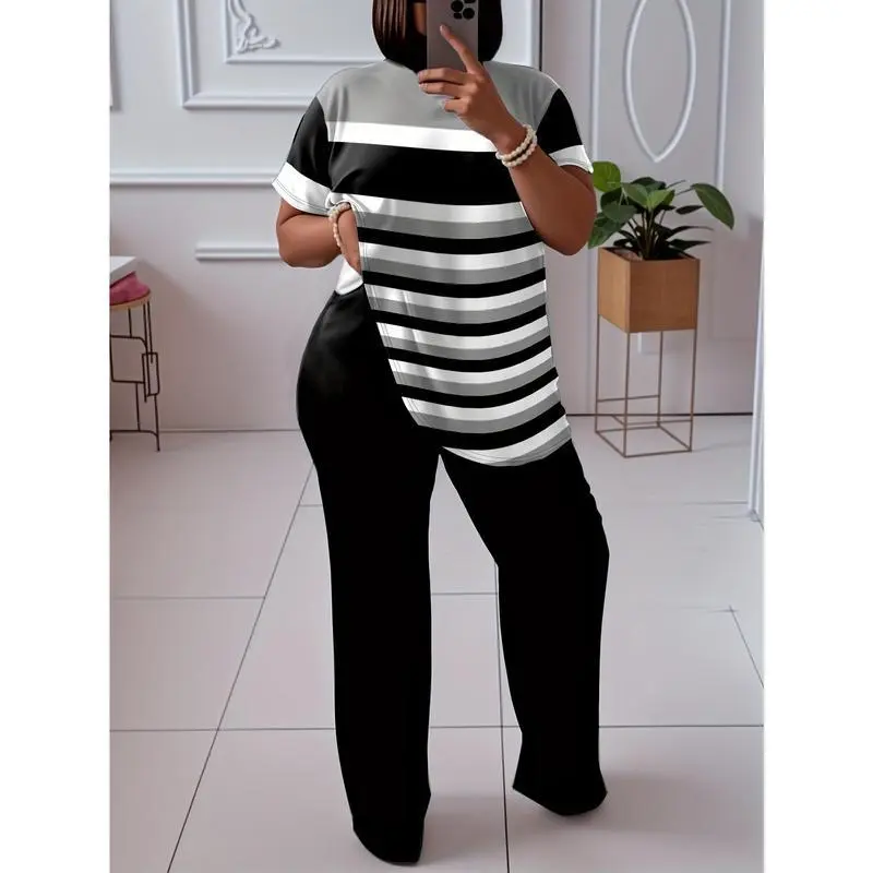 Top Length:ShortWaist Height:High Waist Elevate your wardrobe with this stylish and versatile two-piece set, designed for comfort and style. Two-Piece Set: This set includes a round neck top and straight pants, offering a coordinated look that pairs effortlessly with various outfits. Plus Sizes: Available in plus sizes, this set is for women who appreciate a flattering fit. Striped Print: The striking striped print adds a modern touch to your outfit, making it a standout piece in your collection. Comfortable Fit: The top features a round neck and short sleeves, ensuring a relaxed and comfortable fit for all-day wear. This set is a must-have addition to your wardrobe, for any occasion.