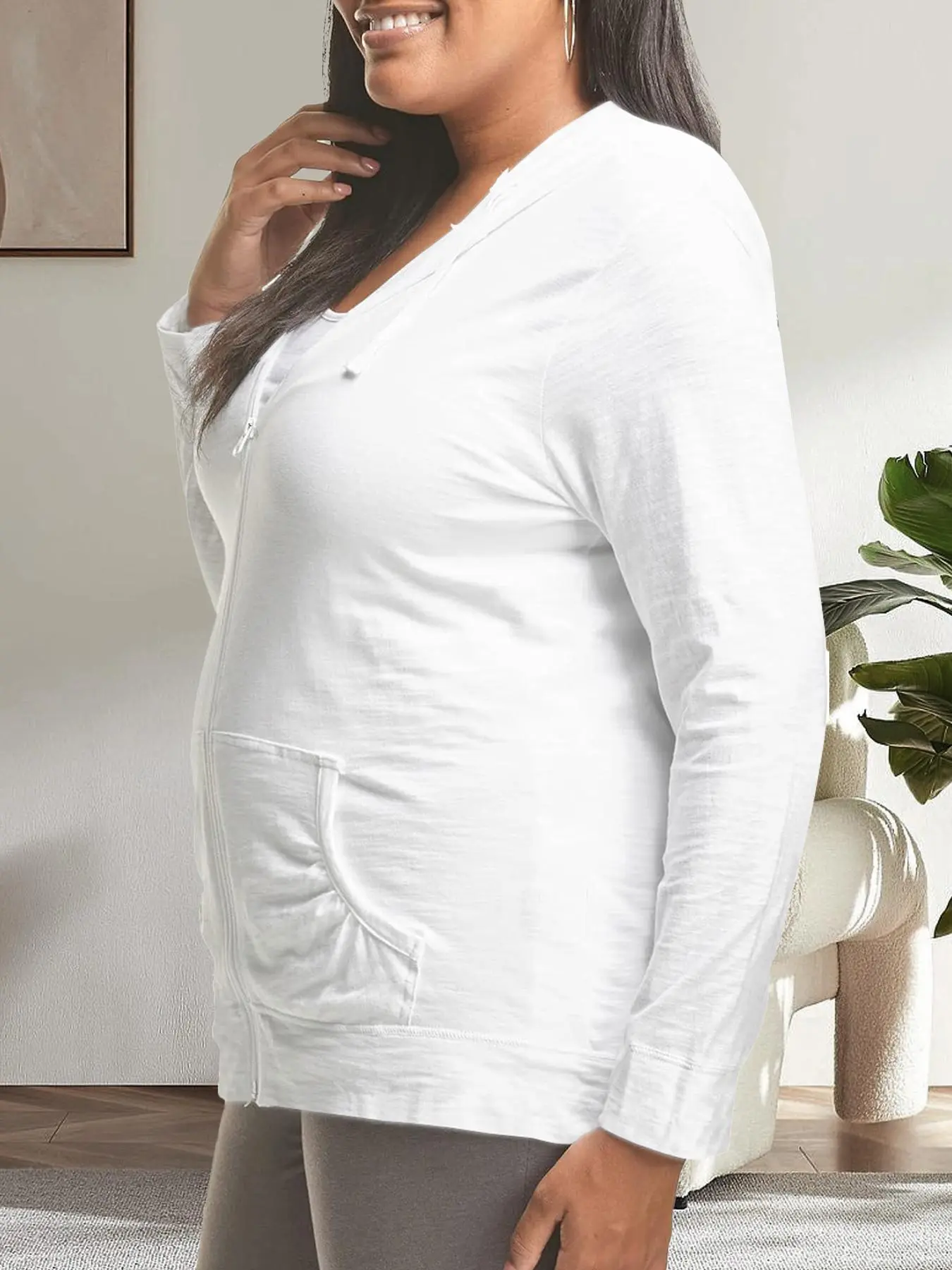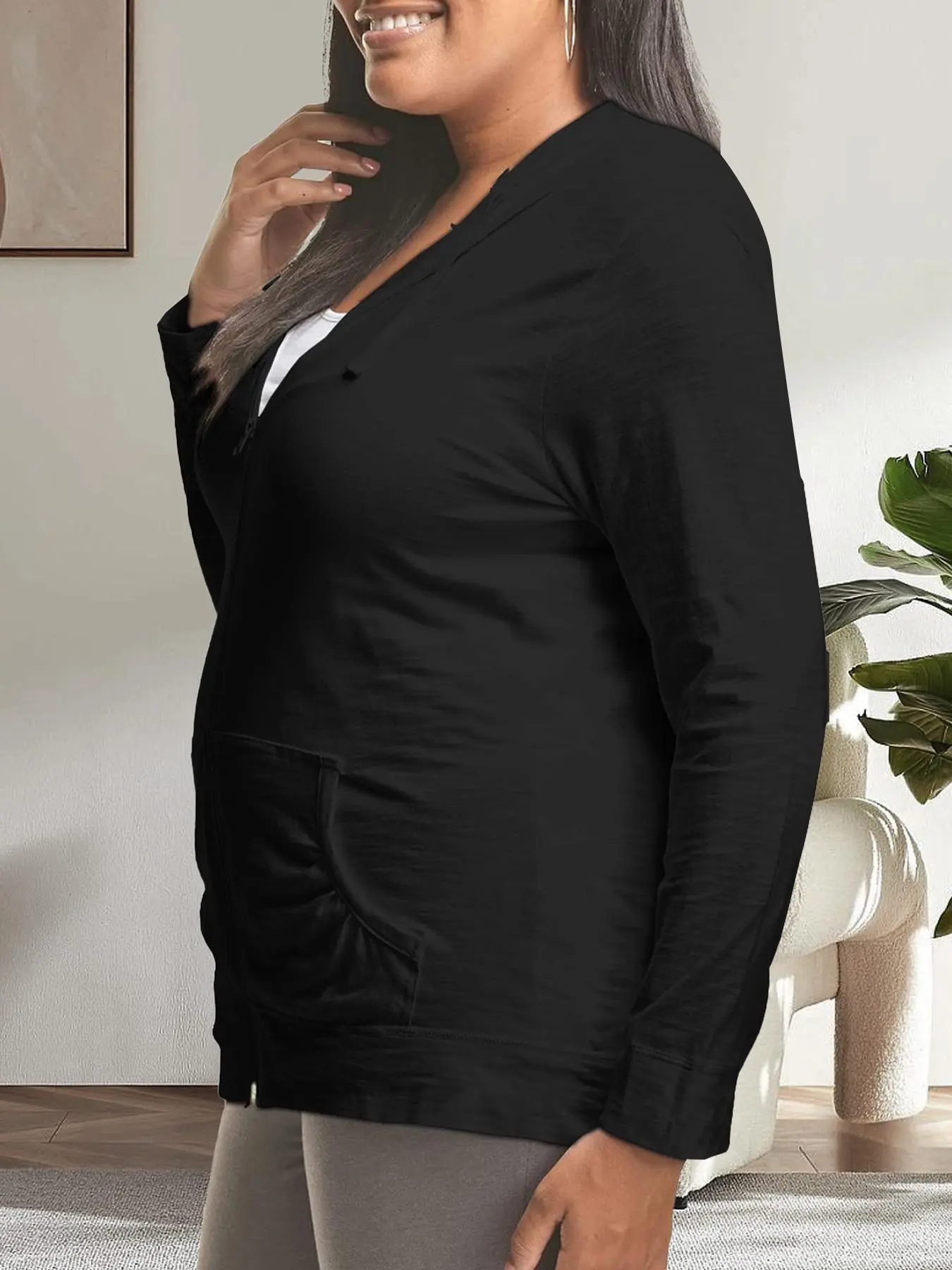 A comfortable, high-quality plus-size hooded zip-up jacket with drawstring pockets, perfect for layering through fall and winter in sizes 1XL–5XL. #plussizefashioninspo #fallwinterstyle #layeringseason #curvystyleinspo #fallfashionfinds