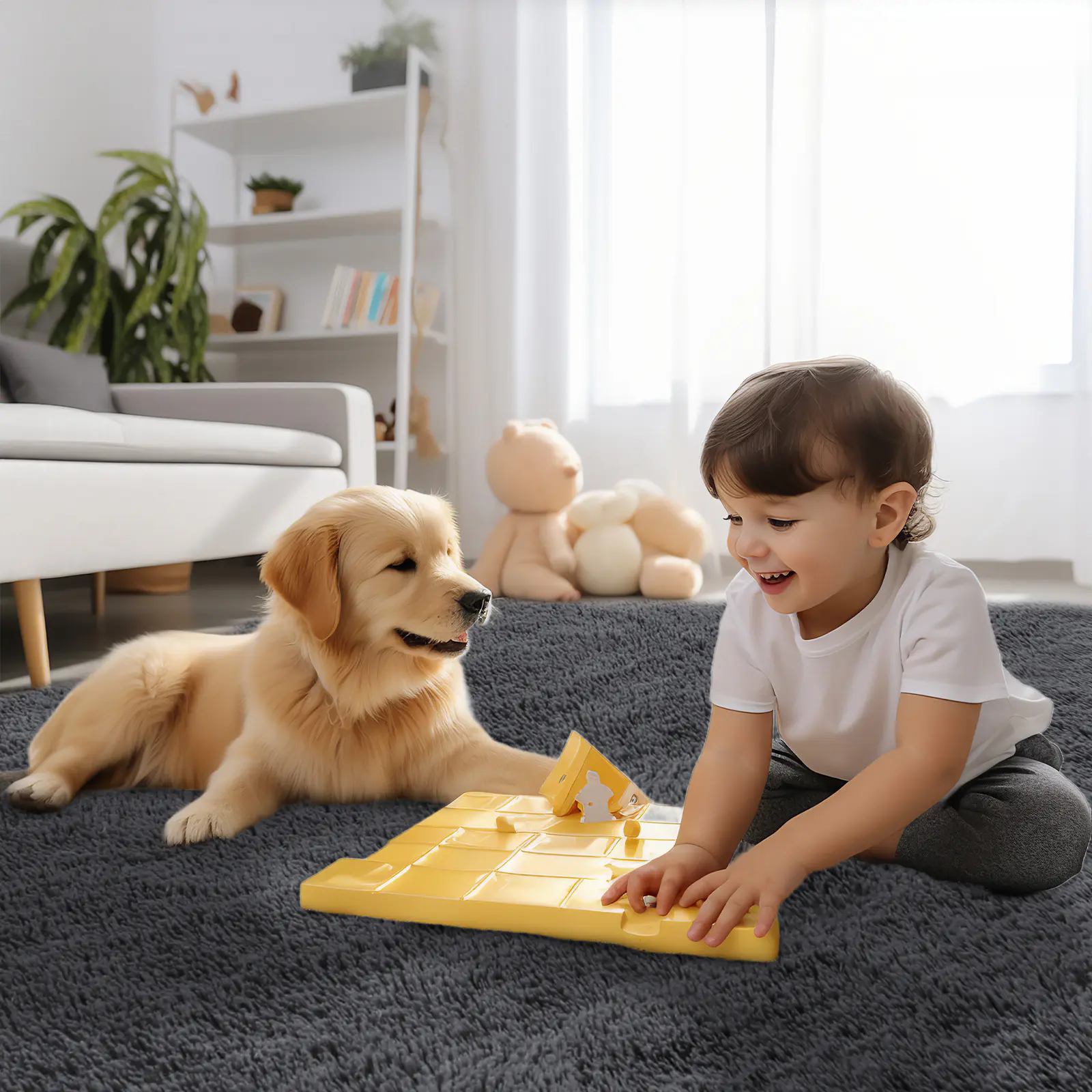 【Super Soft Feeling】The Area Rug is crafted from premium fiber material, offering a luxurious and velvety texture that effectively absorbs dust. Its middle layer features high resilience sponge to reduce foot pressure and enhance overall softness, making it perfect for lounging or playing games with family.