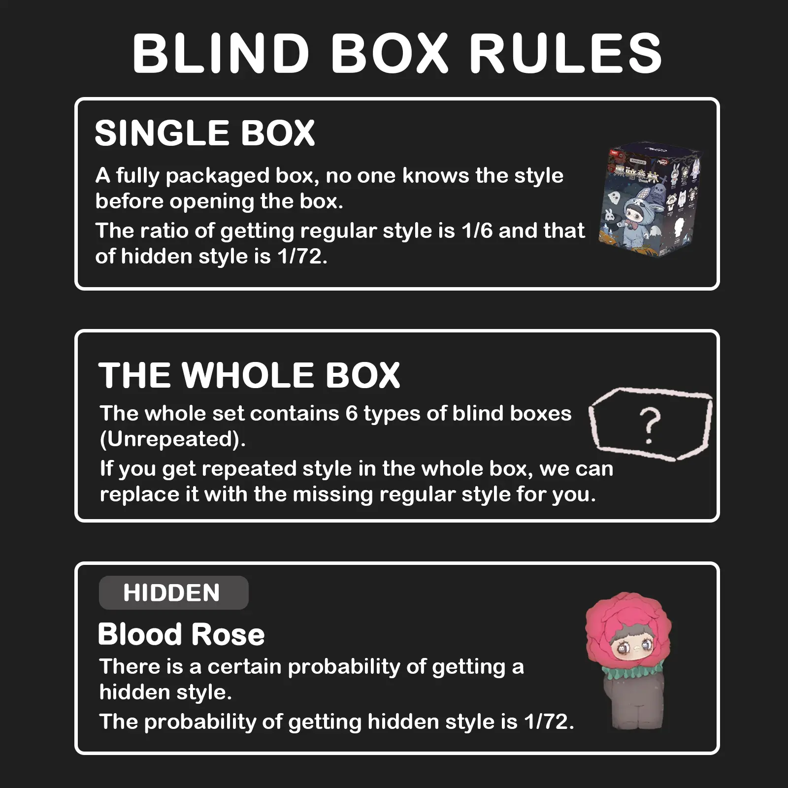 2. The production ratio of hidden mini-figure (Blood Rose) is 1:72.