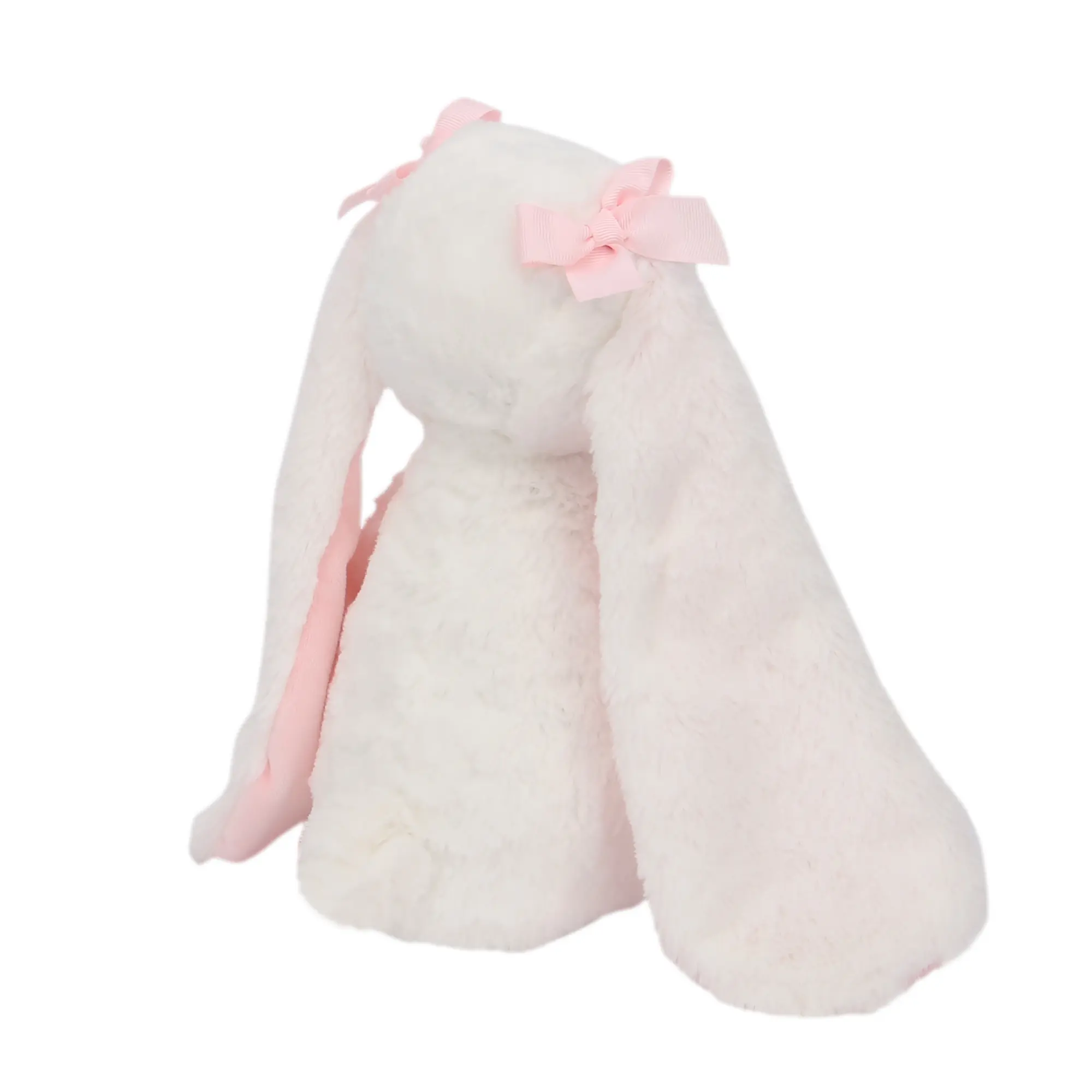 My name is Snowflake. I am a 13” tall white bunny with very long floppy ears. My furry body is soft and cuddly, and the inside of my ears are pink velour. I always wear pink bows and my eyes, nose, and mouth are embroidered so I am completely baby safe. I make the perfect baby shower gift or welcome home baby gift.