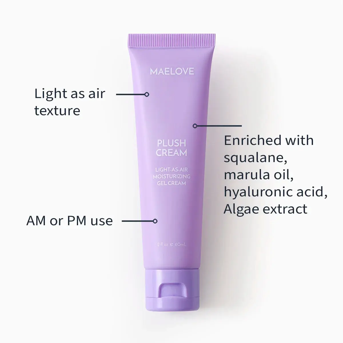 An ultra lightweight, gentle moisturizer that locks in hydration for nourished skin without a heavy feel. Key Benefits: Hydrates skin, repairs the skin barrier, calms irritationIdeal for layering after your serums, Plush Cream is a light-as-air daily moisturizer enriched with hyaluronic acid, squalane, and marula oil to thoroughly hydrate and support skin with a featherweight feel.We combined these powerful hydrators alongside anti-aging and calming ingredients like niacinamide, panthenol, algae extract, and aloe. Together, the nourishing blend repairs and restores the skin barrier while improving fine lines, calming redness, and comforting irritation.With added antioxidant-rich white tea and anti-inflammatory bisabolol, our quick-absorbing, non-comedogenic formula disappears into the skin, providing long-lasting hydration for a smooth, soft complexion.This airy gel cream can be used by all skin types, but is especially helpful for oily or combo skin types, and in hot or humid climates.