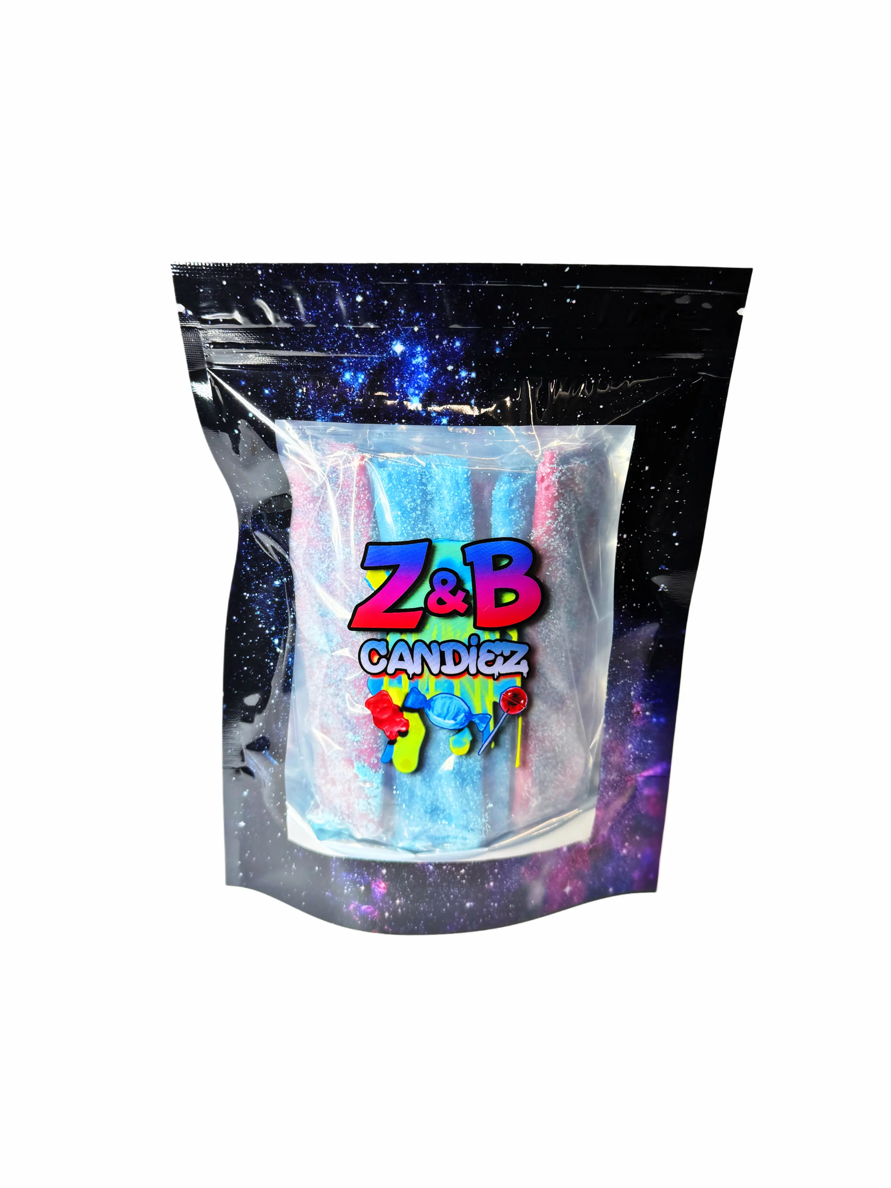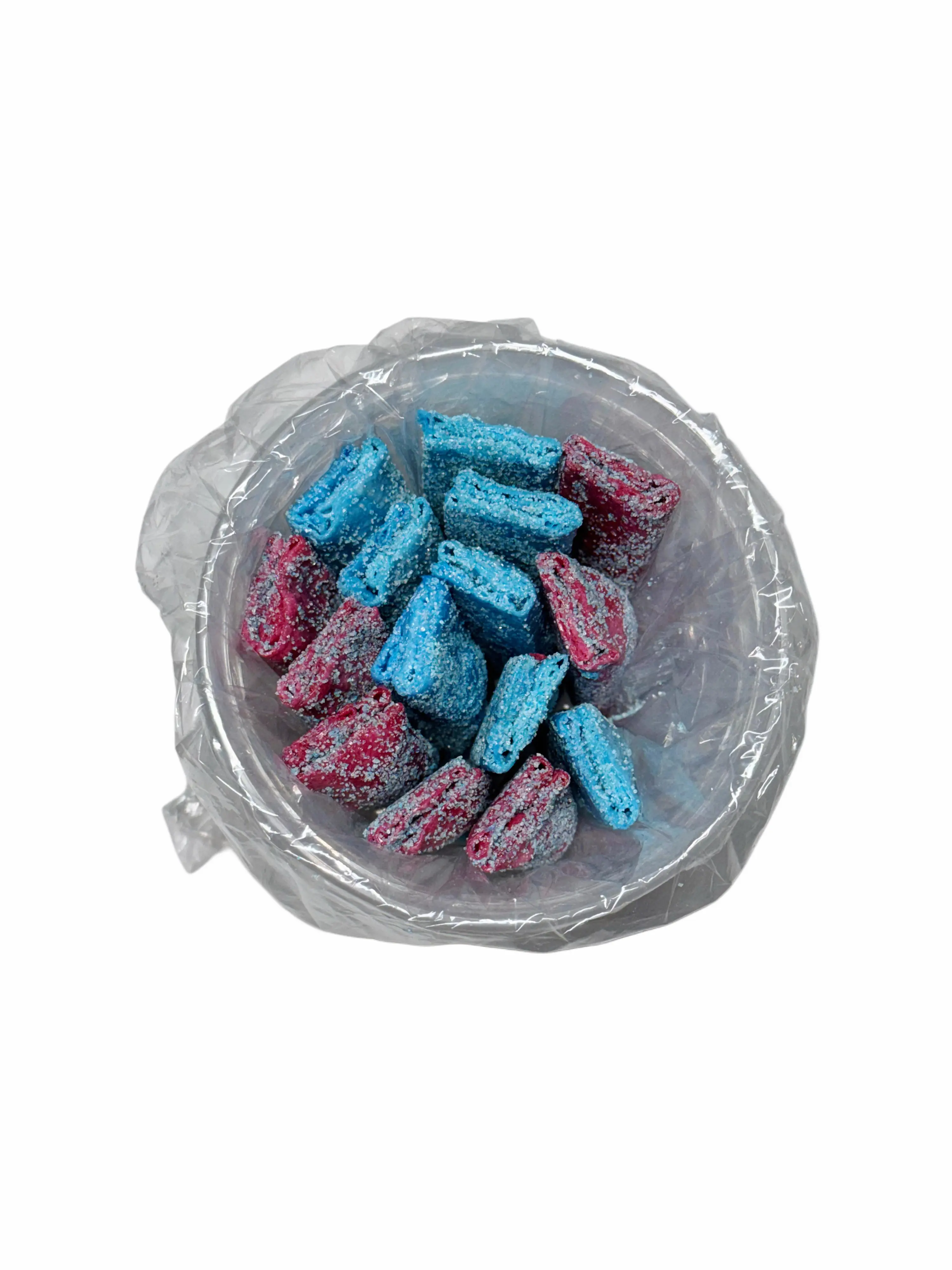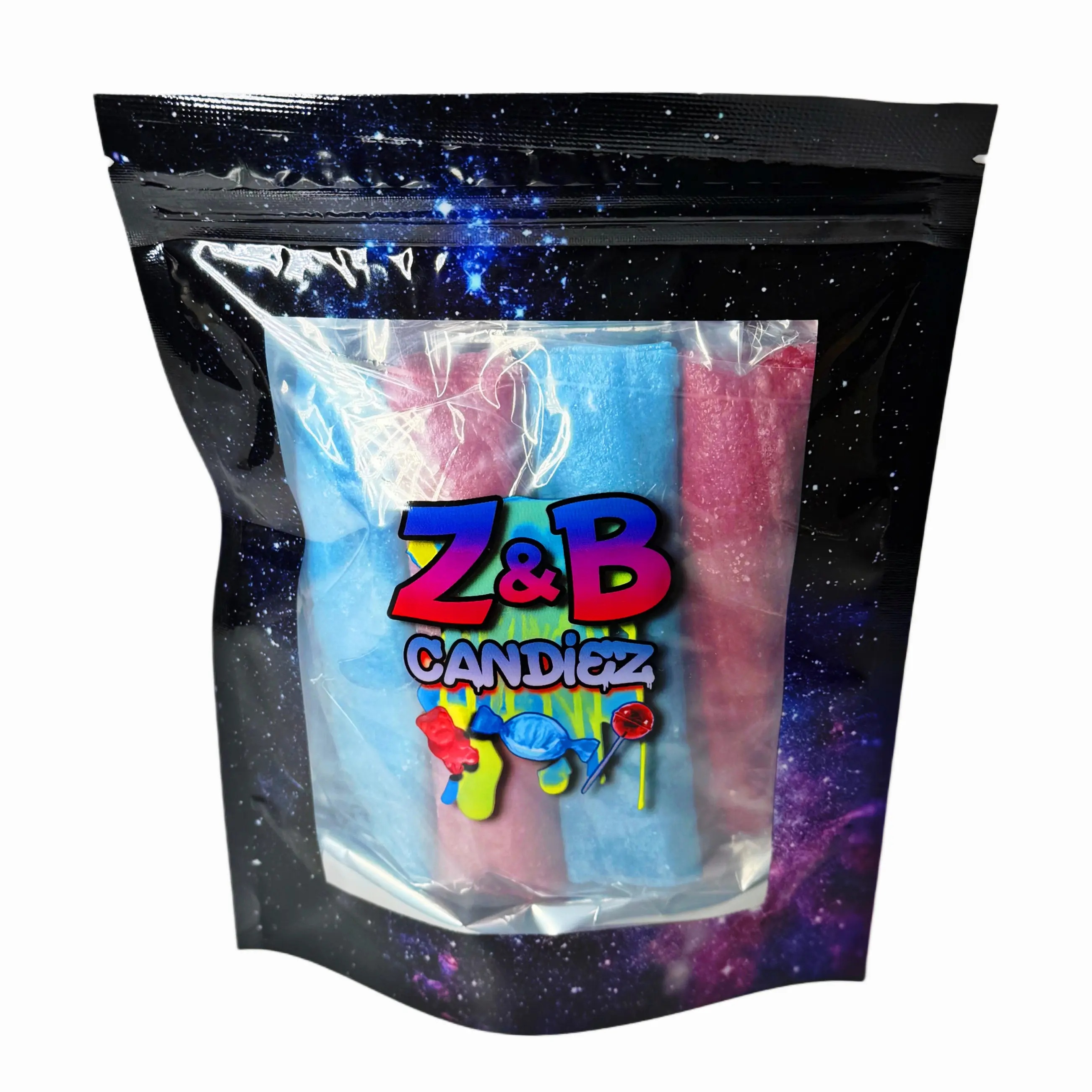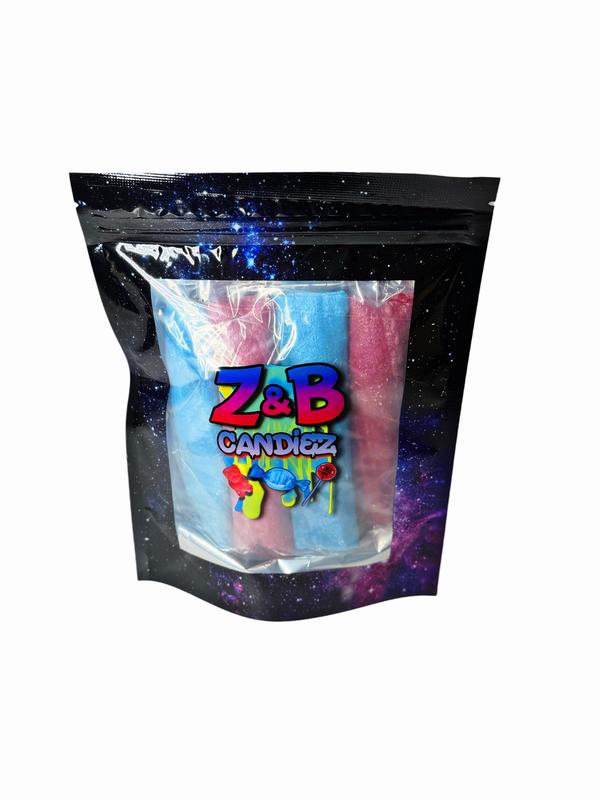 INGREDIENTS: Tropical, Blue Razz and Strawberry flavored fruit roll up's coated in flavoring.