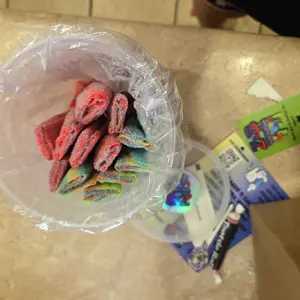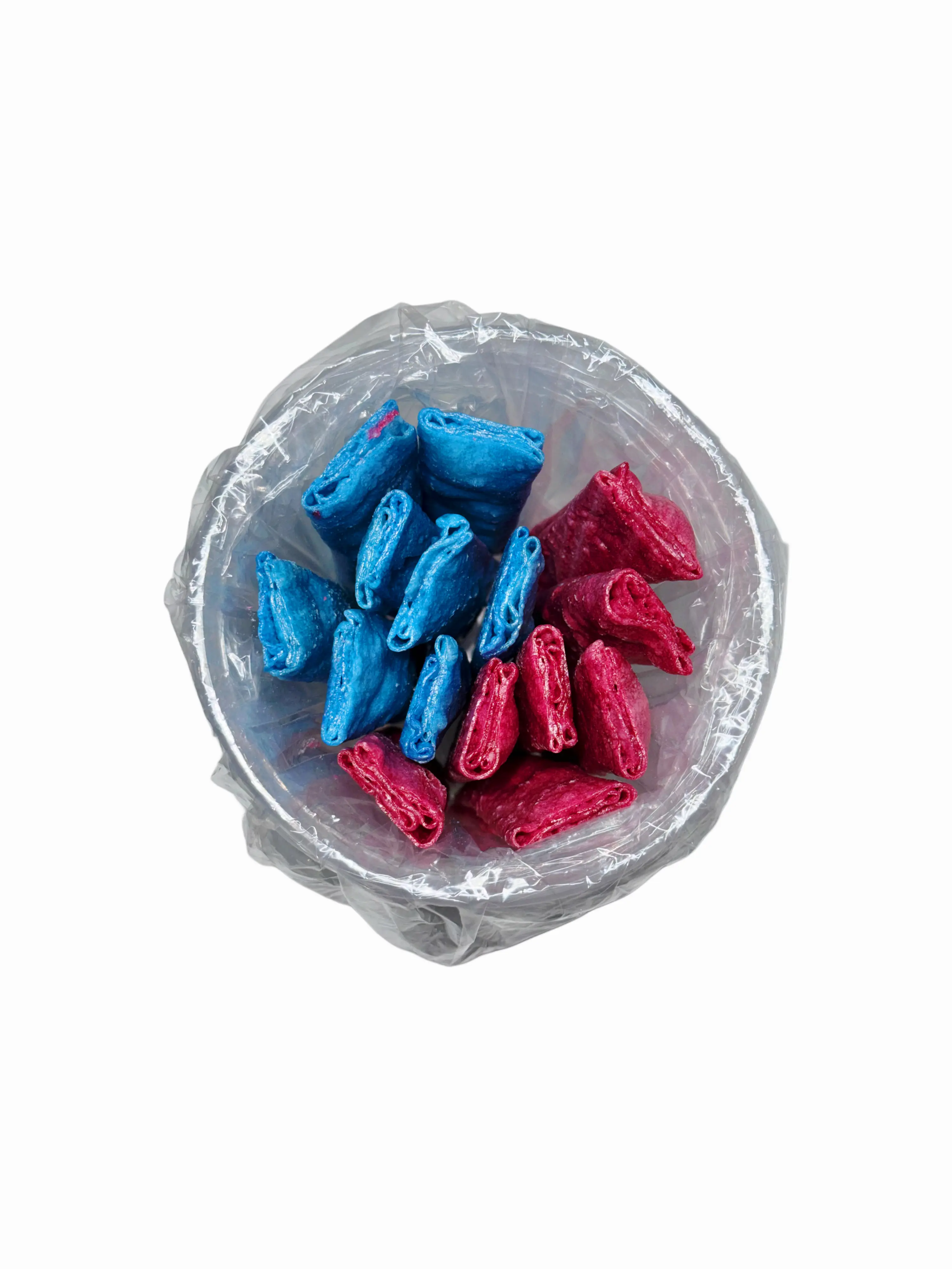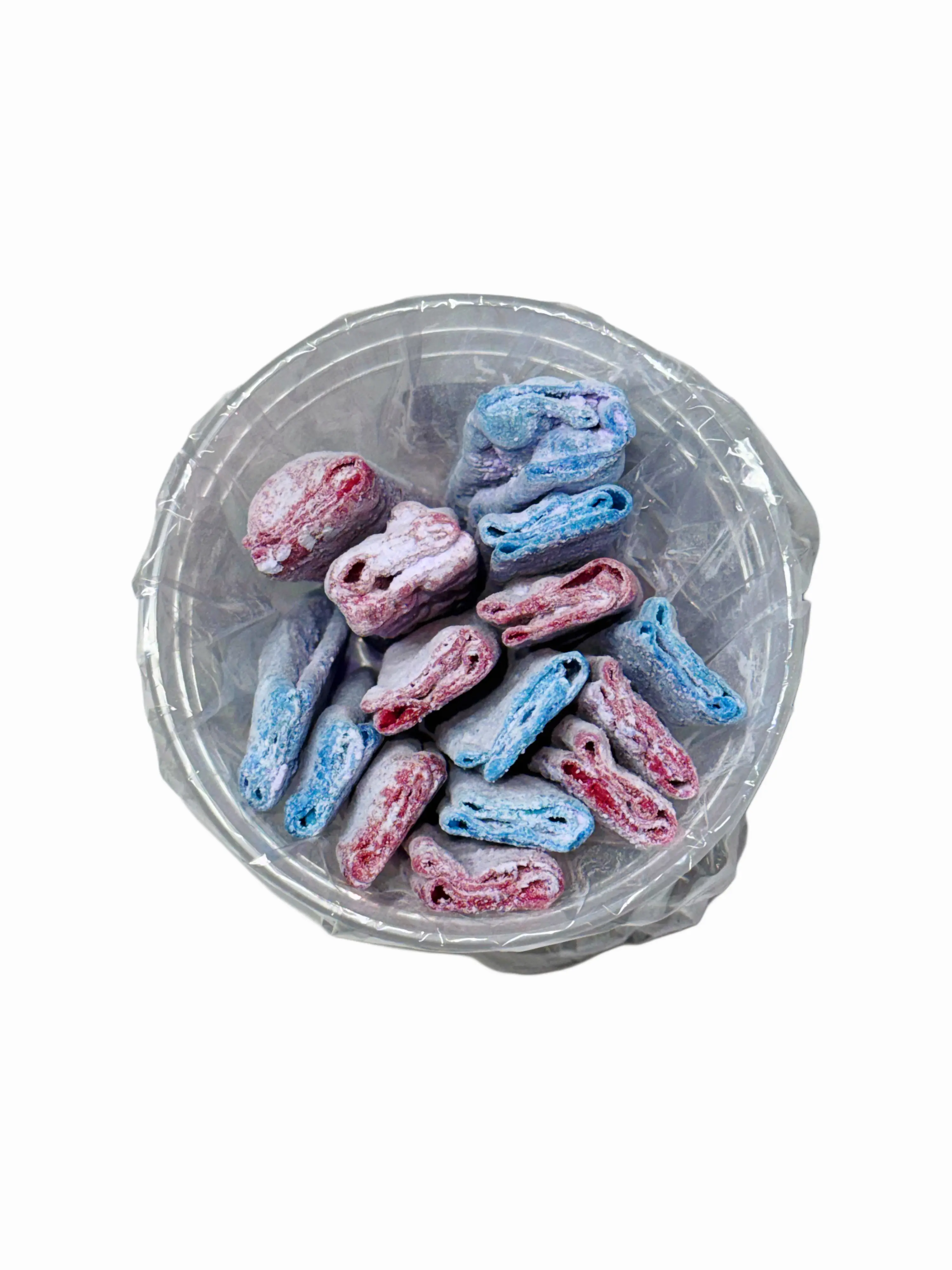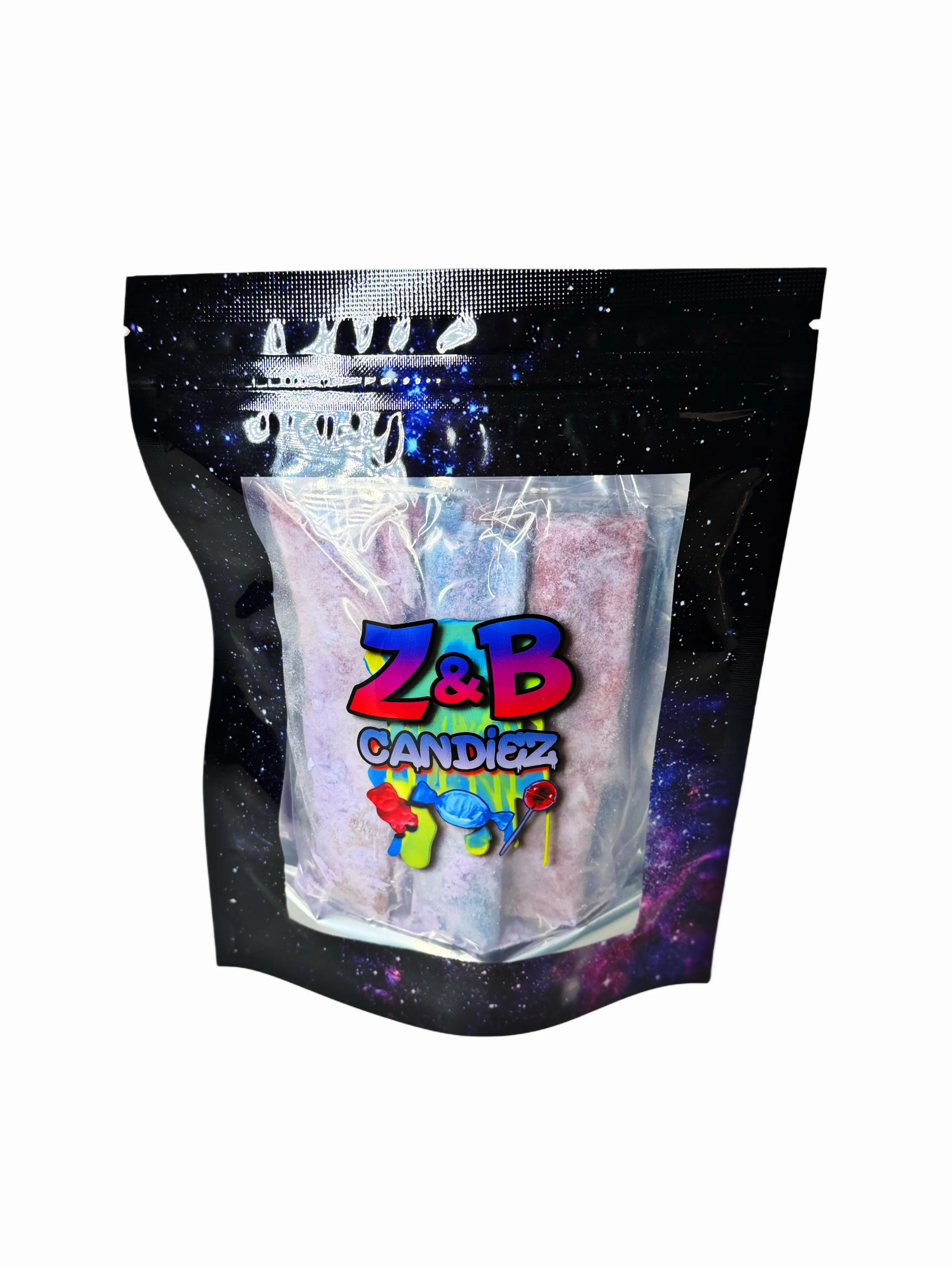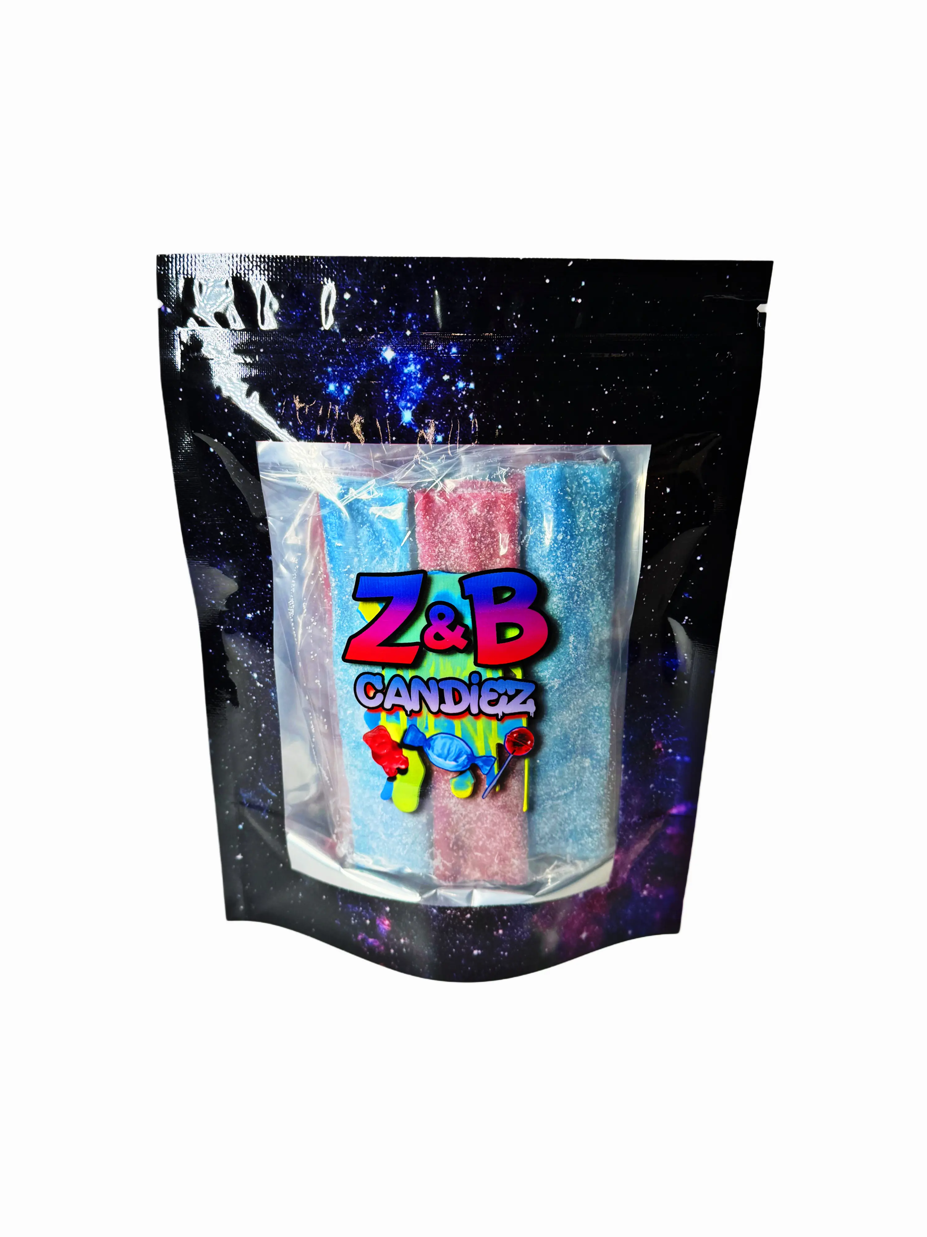 INGREDIENTS: Tropical, Blue Razz and Strawberry flavored fruit roll up's coated in flavoring.