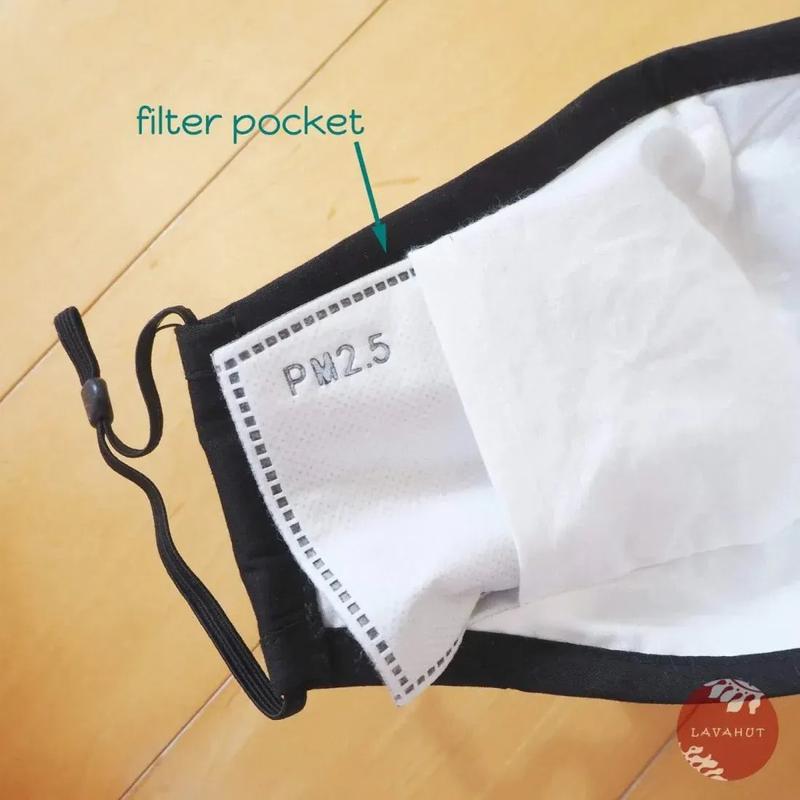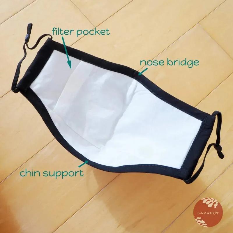 Full feature face mask with exhale valve.  100% cotton fabric with inner pocket for PM 2.5 filters (included).  Adjustable ear loops and nose clip for custom fit.