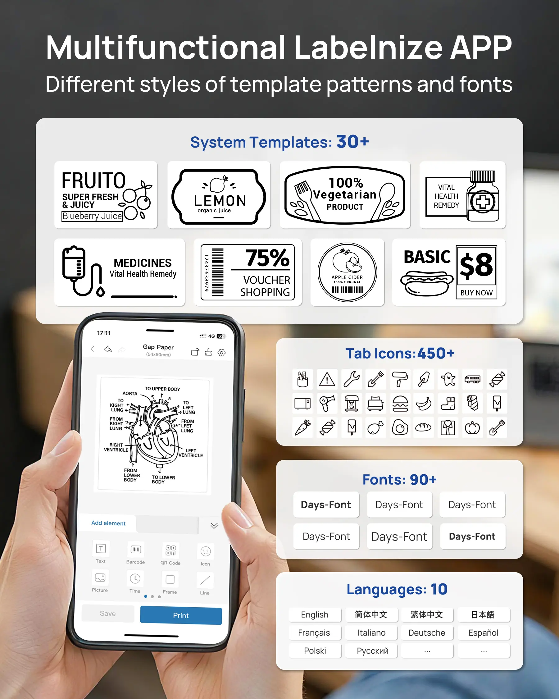 ·Feature-Rich App: PM260 label maker machine with tape comes with label templates and can set up your own templates.The sticker label printer app supports QR codes, barcodes, tables, text, icons, and more. Enjoy 90+ fonts, 14+ languages, and 450+ material presets. Pro tip: Use our specialized labels for optimal results—avoid tearing the green back sticker to prevent printing issues
