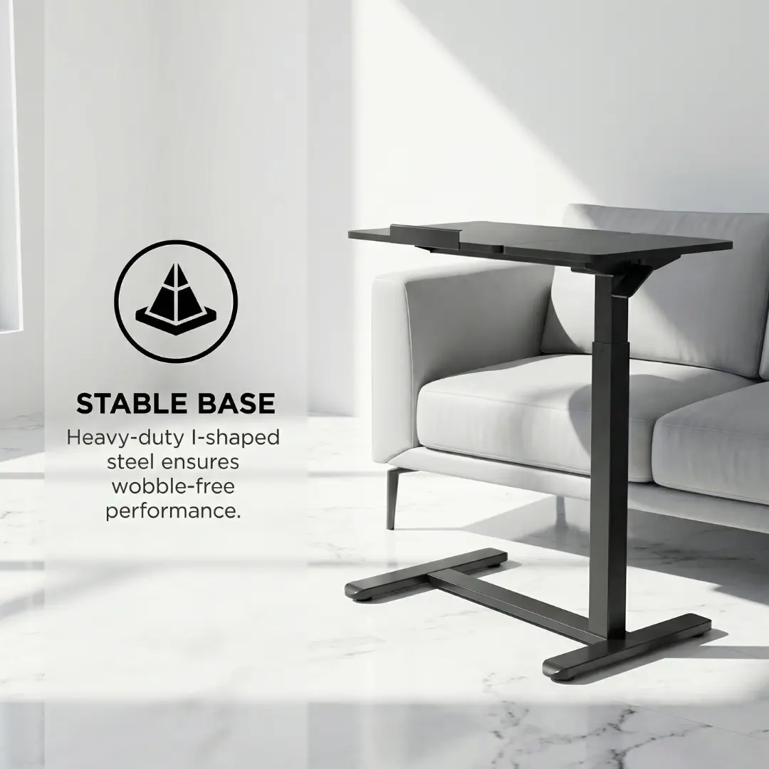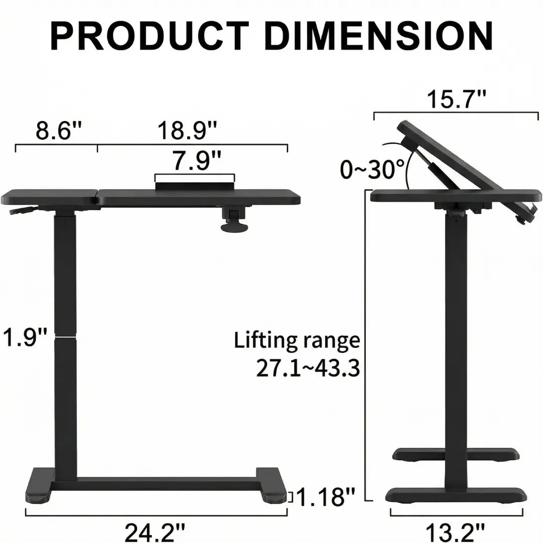Pneumatic Overbed Table with Wheels, Height Adjustable Mobile Laptop Desk, Tilting Split Top Bedside Stand for Sofa, Hospital, Home Use (Black)