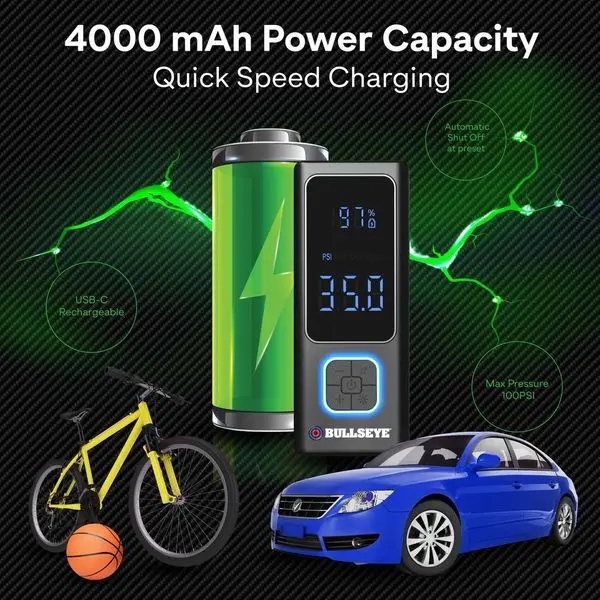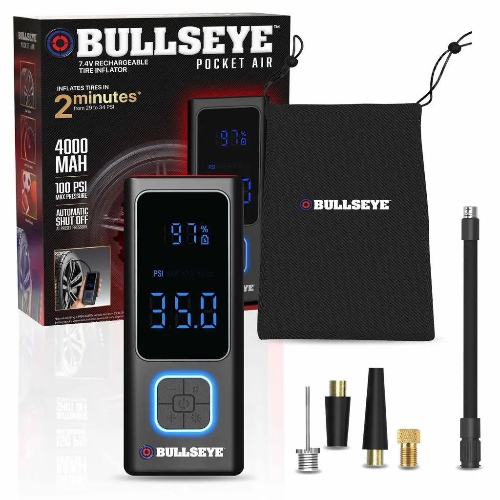 ·EASY TO CARRY: The Pocket Air Pump tire inflator portable air compressor, by Bullseye Pro, is engineered to fit comfortably in your glove box, backpack, or even your pocket! Whether you're on a road trip, biking adventure, or simply commuting, its ultra-compact size ensures that you’re always prepared. Weighing less than a pound, this car tire air pump portable gives you peace of mind wherever your journey takes you.