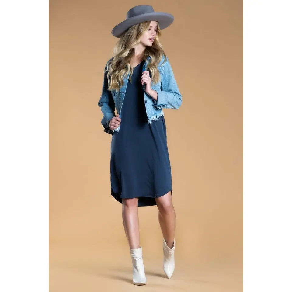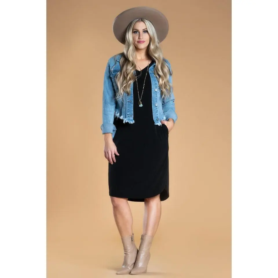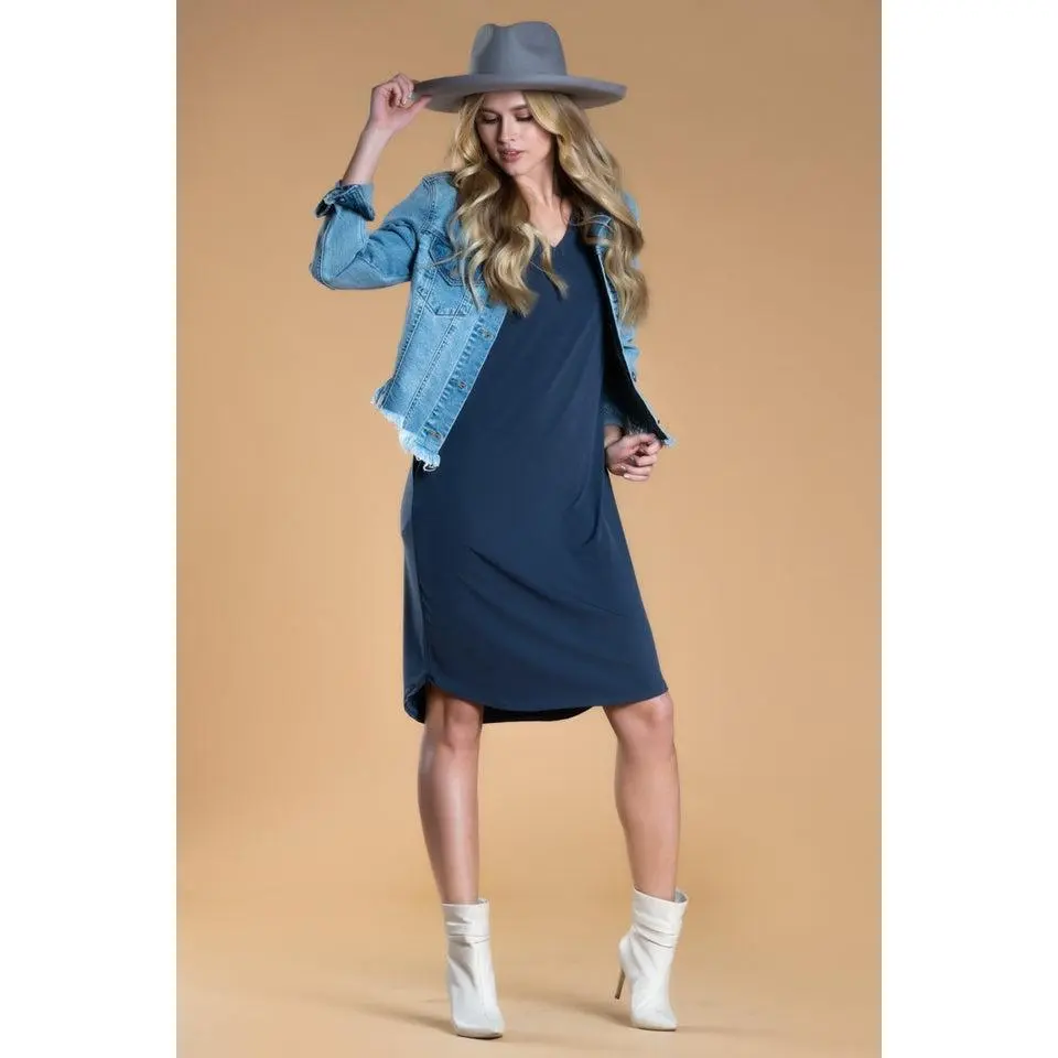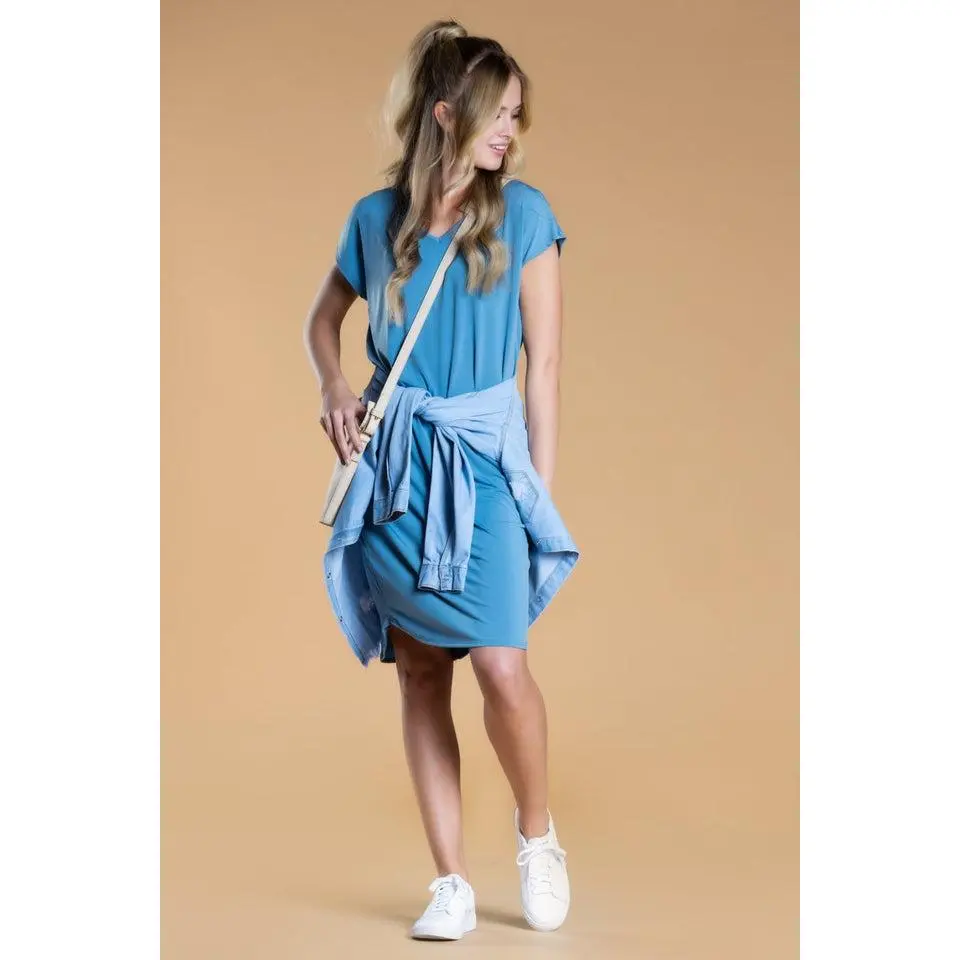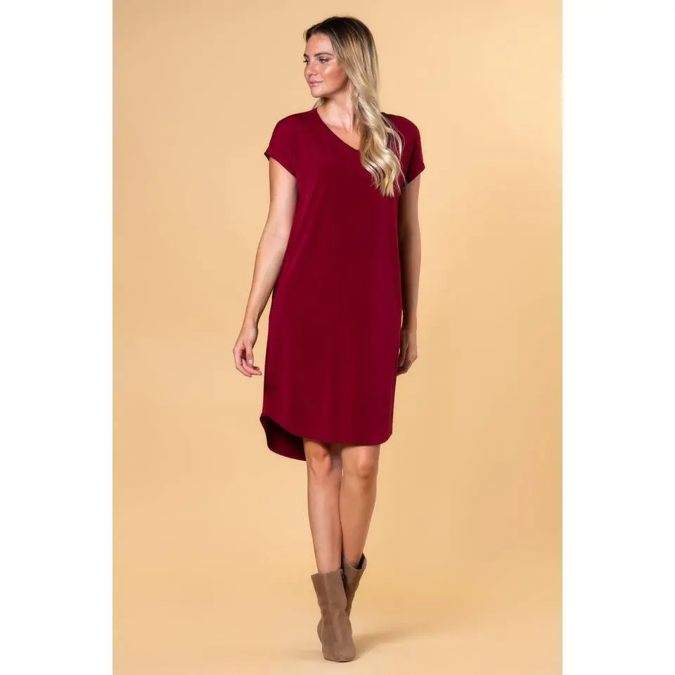 The modest V-neckline and short sleeves create a clean, flattering silhouette that works across seasons, while the slightly rounded hem adds subtle movement without clinging. Thoughtfully designed with functional pockets, this casual dress for women balances comfort and practicality without sacrificing style.