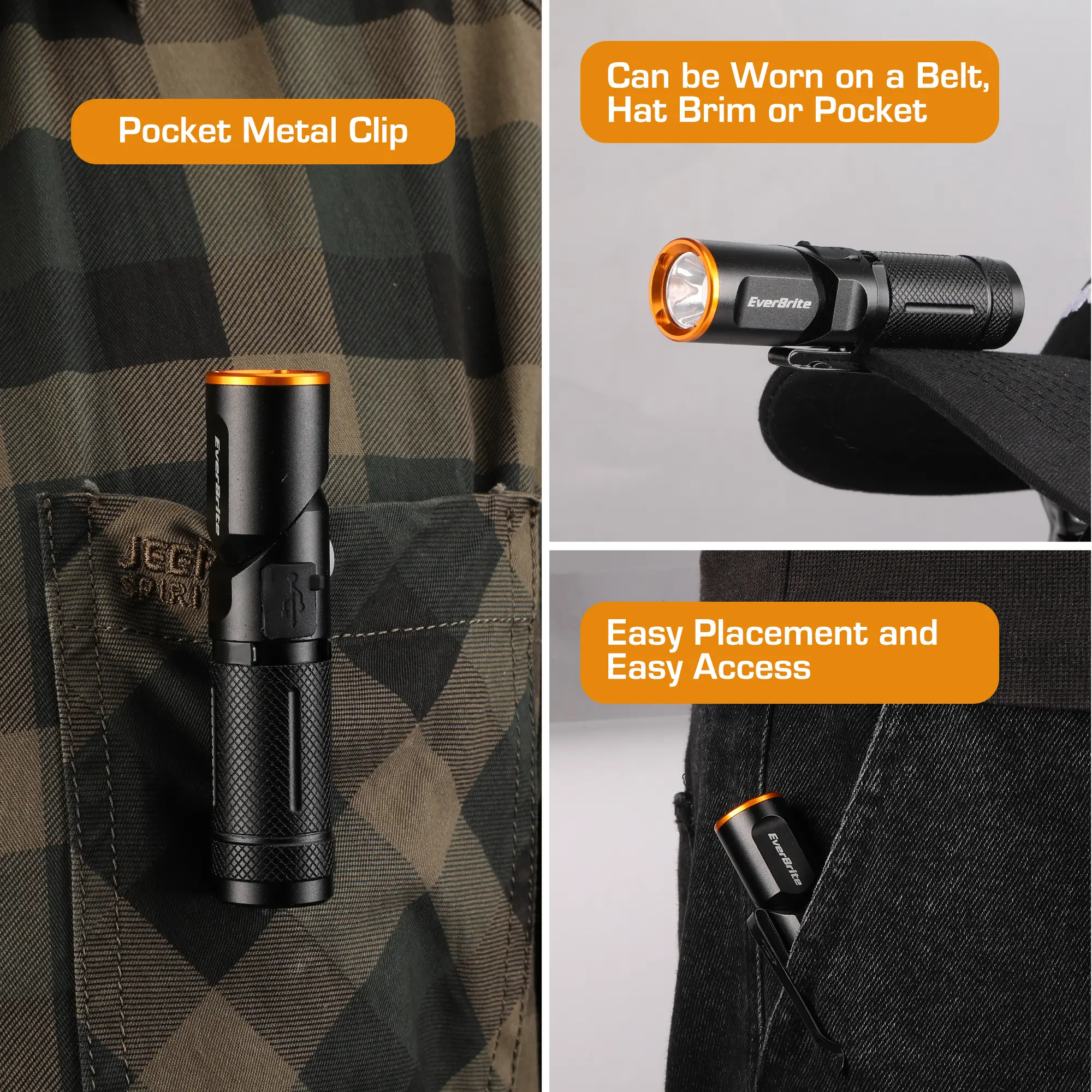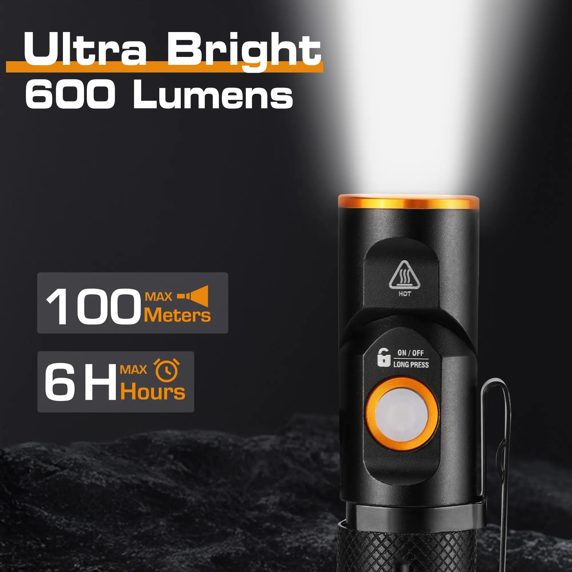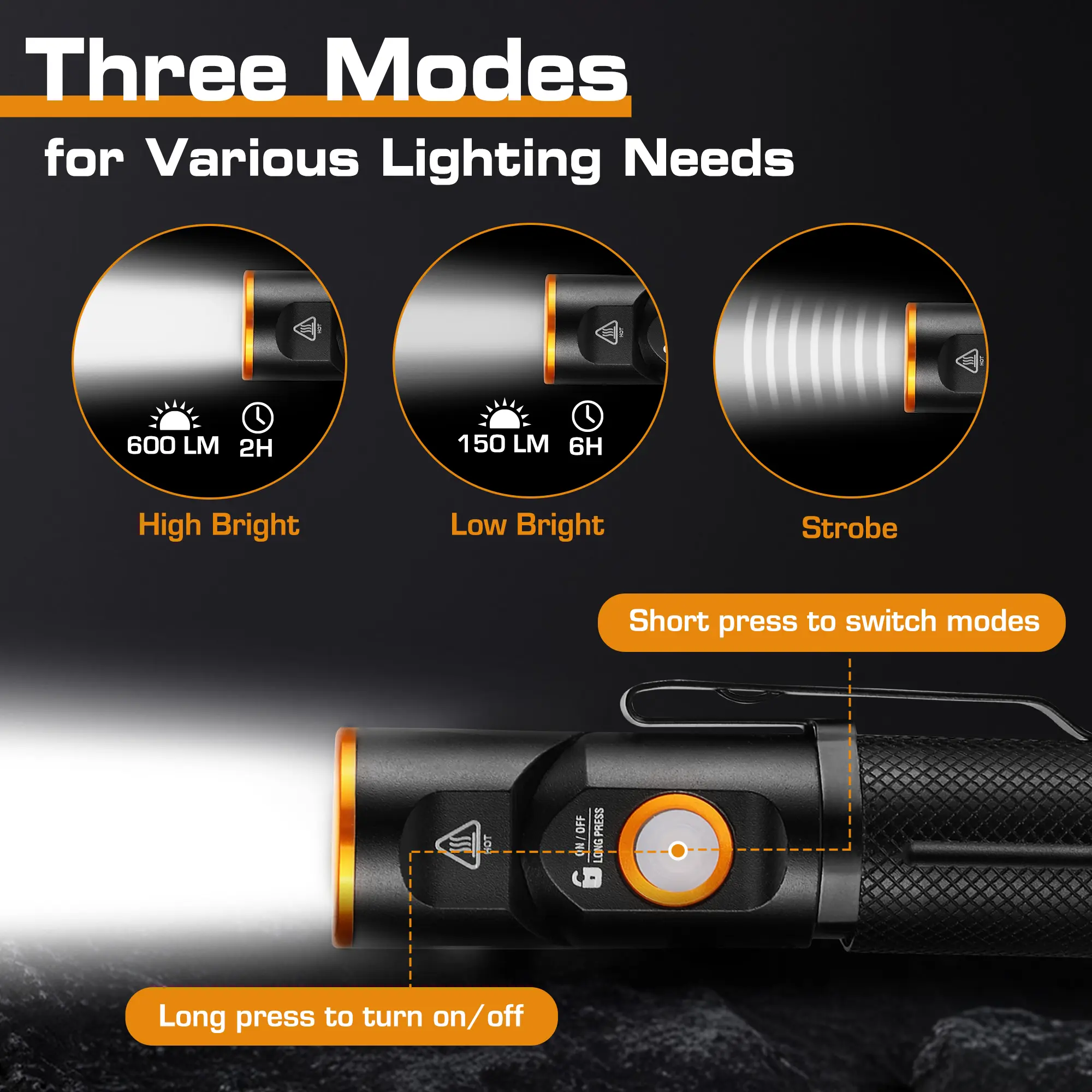 ·𝐔𝐥𝐭𝐫𝐚 𝐁𝐫𝐢𝐠𝐡𝐭 & 𝐓𝐡𝐫𝐞𝐞 𝐋𝐢𝐠𝐡𝐭𝐢𝐧𝐠 𝐌𝐨𝐝𝐞𝐬: EverBrite EDC flashlight has 600 high lumens and the maximum lighting beam can reach 329 ft. The LED flashlight is equipped with high/low/strobe modes to meet your various lighting needs. Hold the power button to turn on/off for two seconds and short press to switch modes