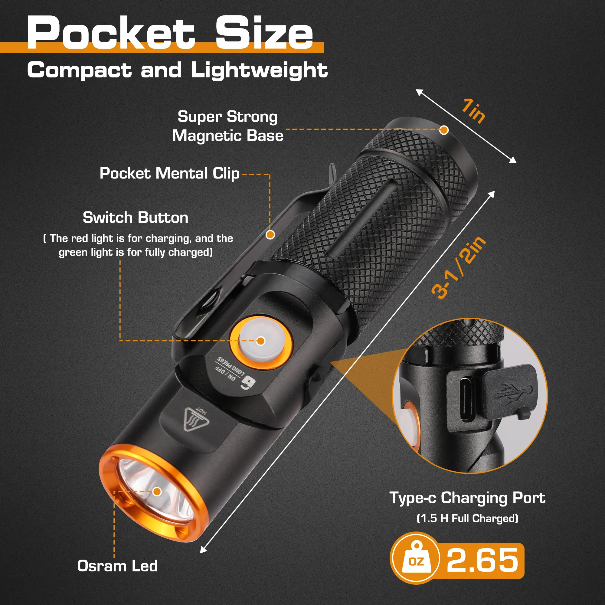 ·𝟗𝟎 𝐃𝐞𝐠𝐫𝐞𝐞 𝐑𝐨𝐭𝐚𝐭𝐞 & 𝐏𝐨𝐜𝐤𝐞𝐭-𝐒𝐢𝐳𝐞: Easily adjust the lighting angle with 90 degree rotation. This mini flashlight measures 3-1/2 ’’ x 1 ’’ as your middle finger and weighs 0.16 lbs, which is very easy to put into your pocket