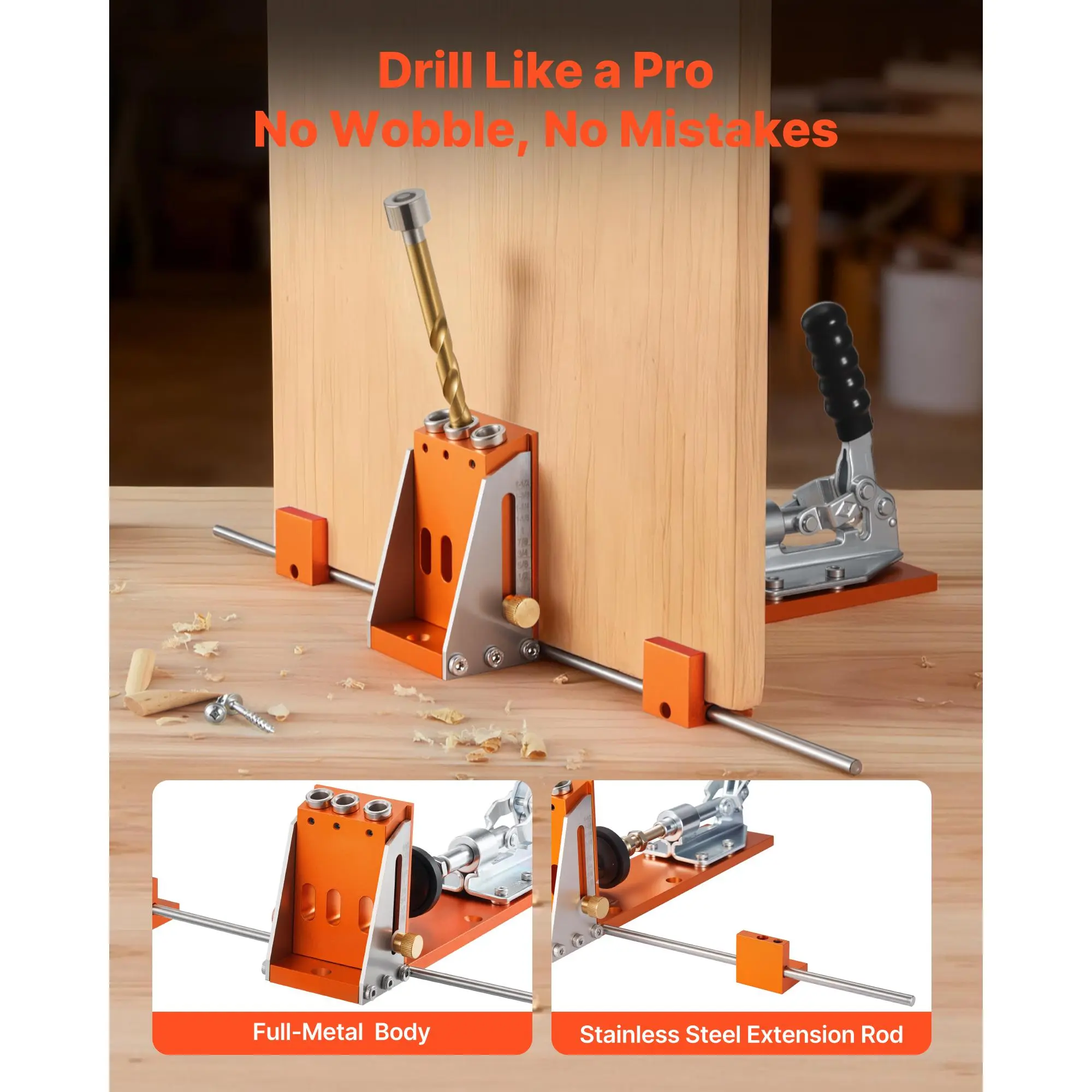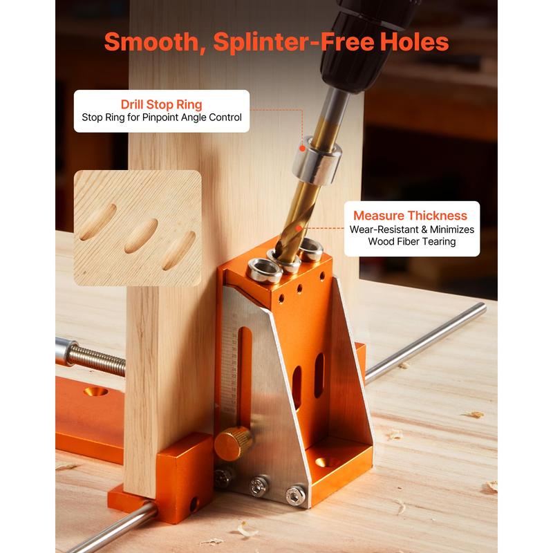 Adjust drilling depth by sliding the marked block up and down. No complex measurements or math are needed. The jig pocket hole system is ideal for beginners, hobbyists, and professionals. It simplifies project assembly, making woodworking tasks easier and more efficient.
