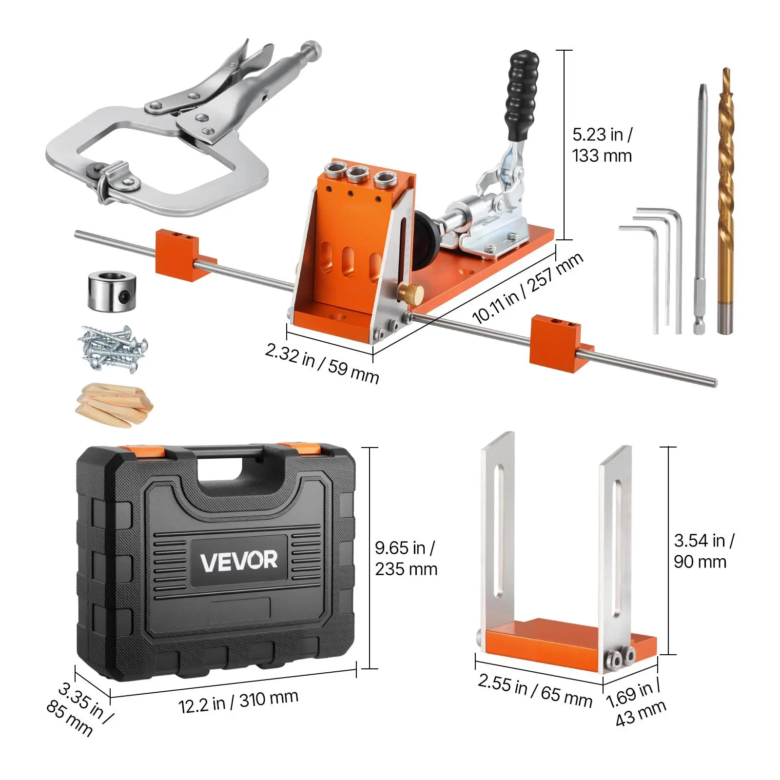 5. VEVOR Pocket Hole Jig Kit, 1/2 to 1-1/2 in Adjustable, Jig Pocket Hole System with Toolcase, C-Clamp, Step Drill, Hex Wrench, Drill Stop Ring, Square Drive Bit, Reinforced Metal Frame, for Woodworking
